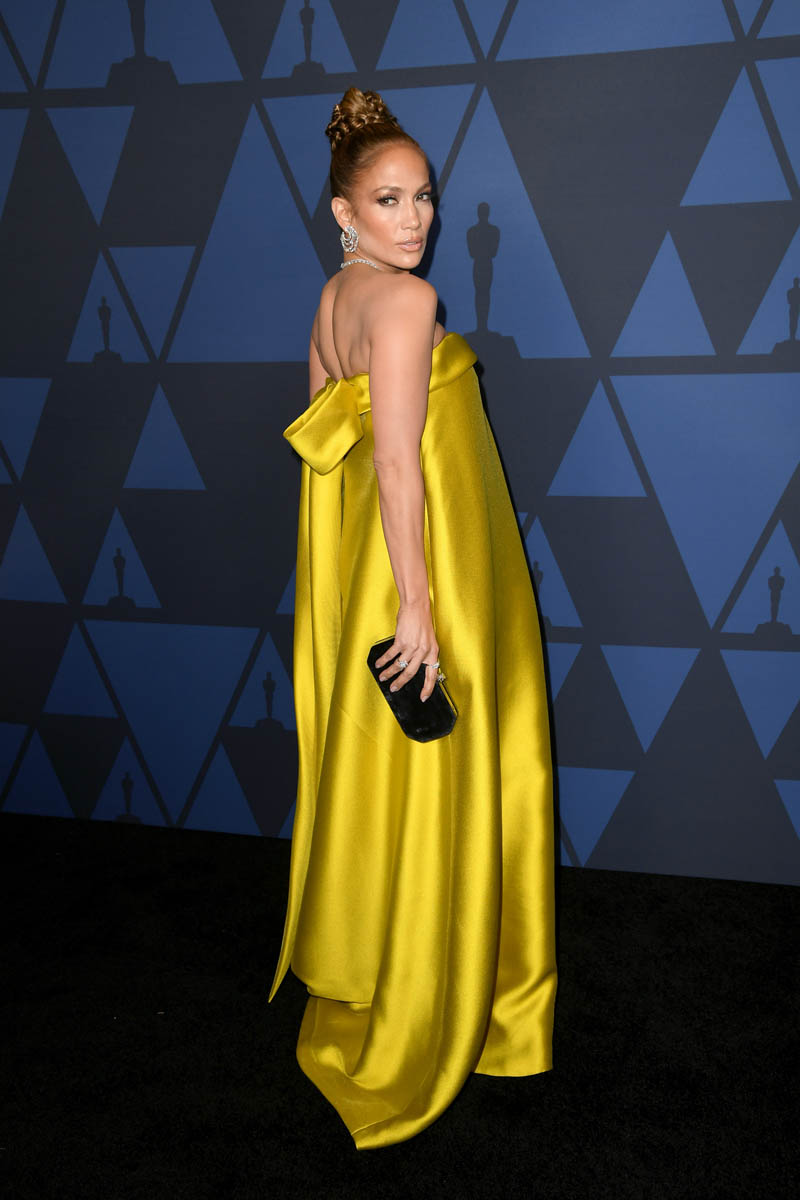 Robert is hoping for his first ever nomination, just like Jennifer Lopez for her work in Hustlers whose chances are much better. JLo was there with director Lorene Scafaria, wearing a gorgeous chartreuse Reem Acra. I love this on her. And this is exactly the right use for the material – away from the body, maximum hang, don’t fold it, don’t bunch it, just let it drop in a sheet, and let the colour and the wearer do the rest. When the wearer is JLo, you don’t have to worry.