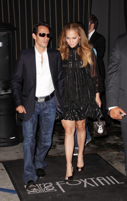 Here’s JLo looking amazing Saturday night with Marc leaving Foxtail – perfect legs, perfect hair, killer dress, and finally a proper makeup artist after too many months without her usual glow. Good timing too. After all, Max and Emme are like chump change next to the Holy Jolie twins. Then again, Jennifer Lopez isn’t competitive at all.