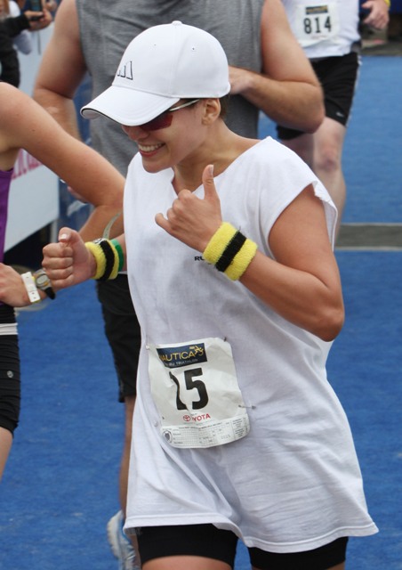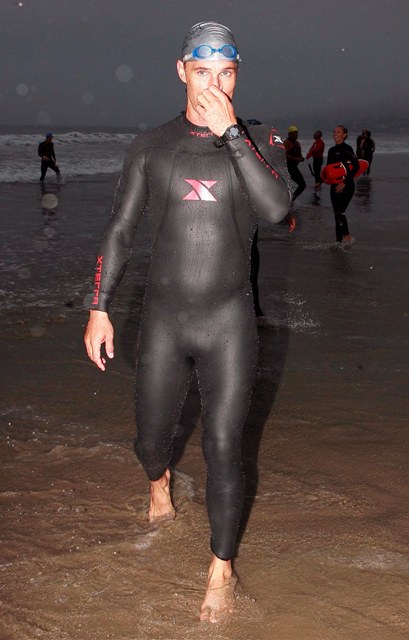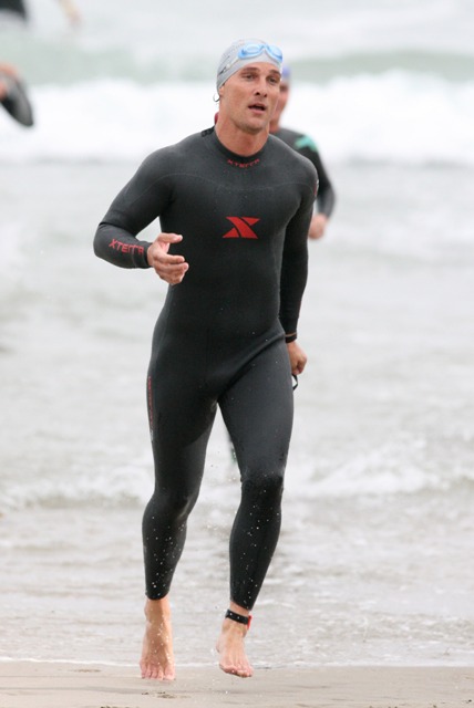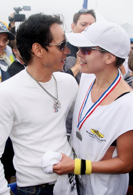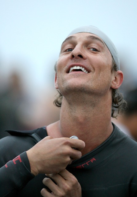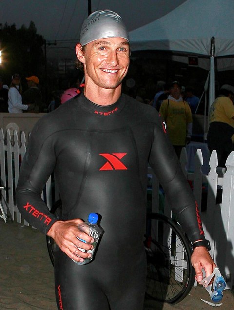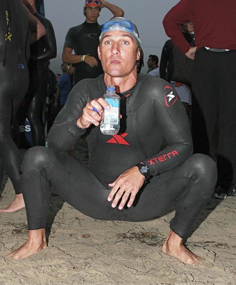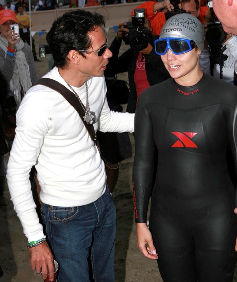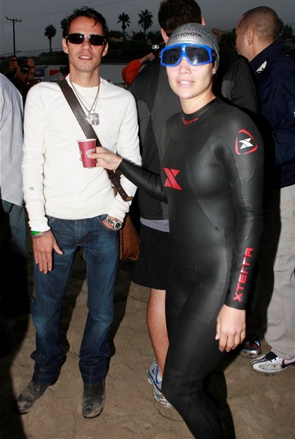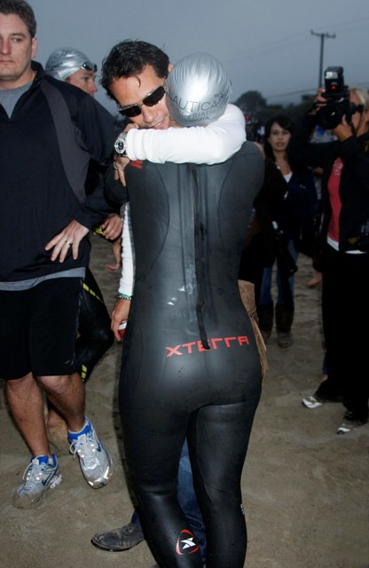 Still… it was an accomplishment to finish. And she was greeted at the finish by an emaciated Marc Anthony a full hour behind former costar Matthew McConaughey who came in at 90 minutes, showing off his ill proportioned body and squatting full spread on the beach in his wetsuit.
