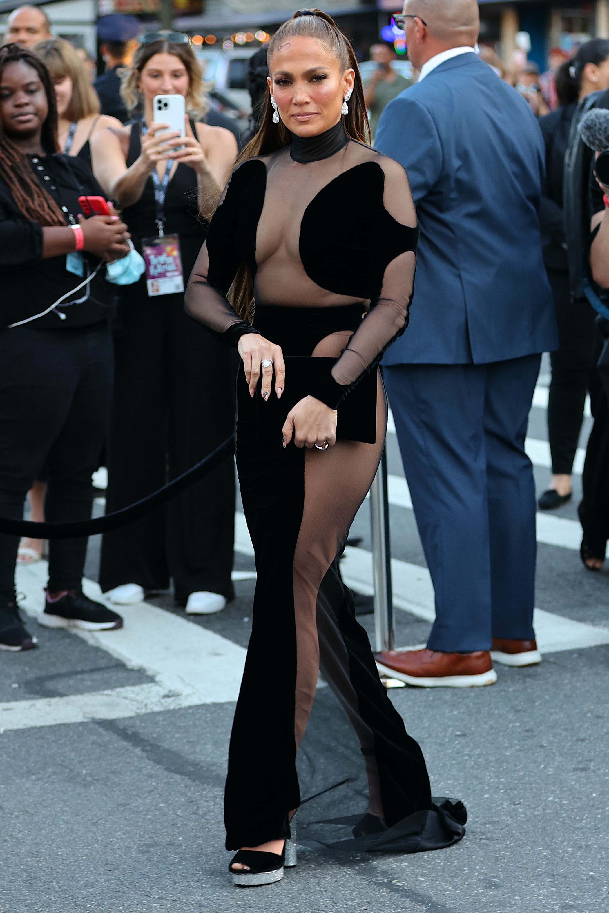 Anyway, we can talk more about Halftime next week when it starts streaming on Netflix. For now, here she is on the red carpet last night in the most JLo dress ever – a sheer and black velvet Tom Ford dress that, well, you can understand why she picked it for this moment in particular. What else did you expect her to wear if not a look that shows off all the things she always wants to show off? I just wish I could find more shots of this from the back because I want to know what those clear straps are connecting to.