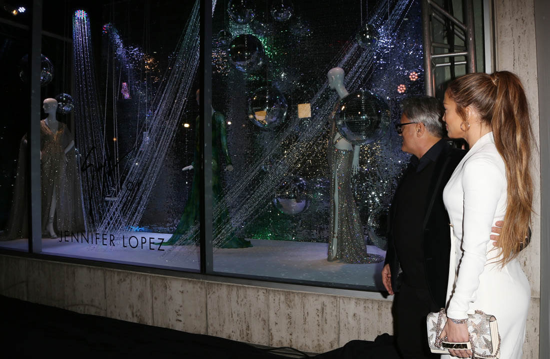 Jennifer Lopez partnered with Giuseppe Zanotti for her own capsule shoe collection and was at the launch last night. Her famous Versace dress was presented in the display window among the shoes.
