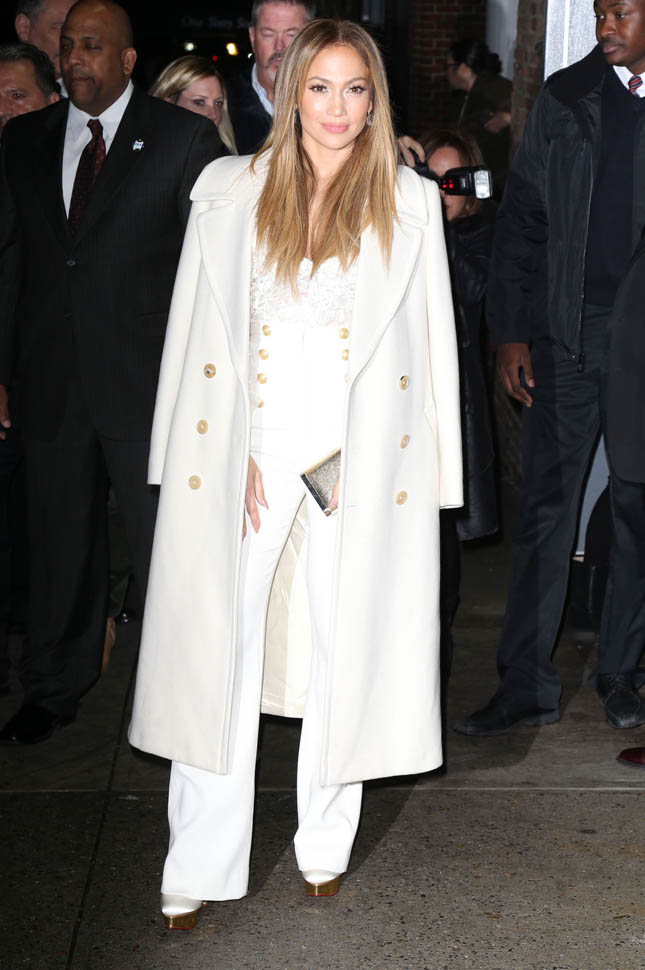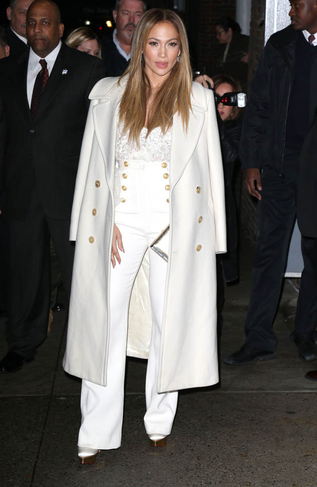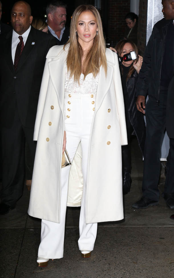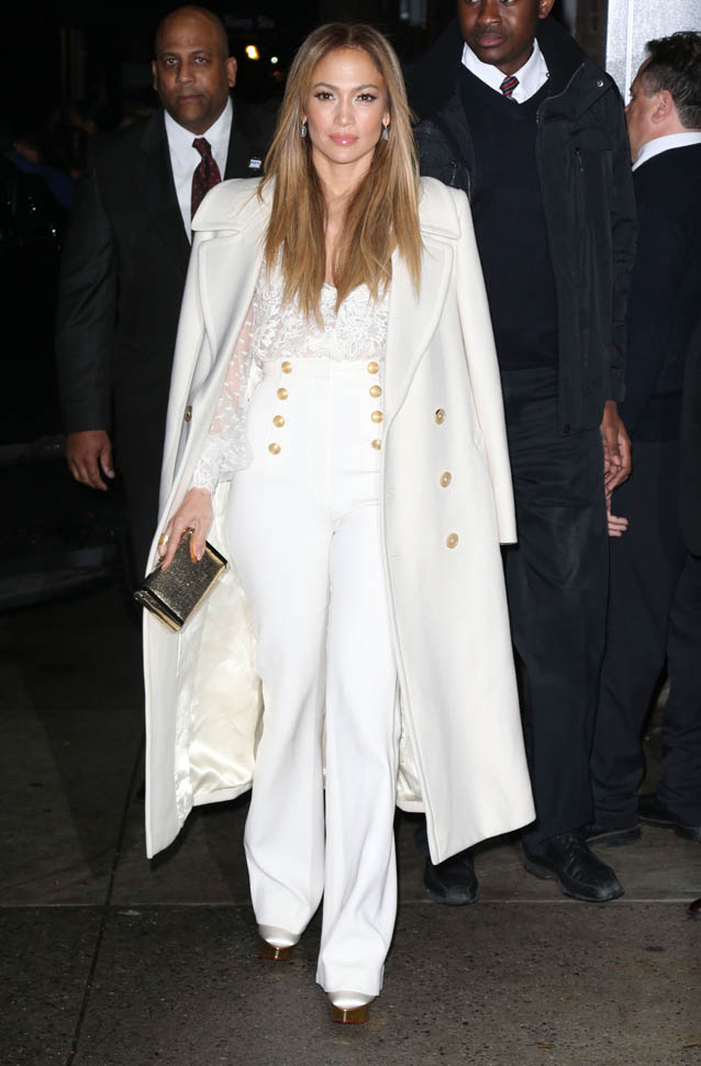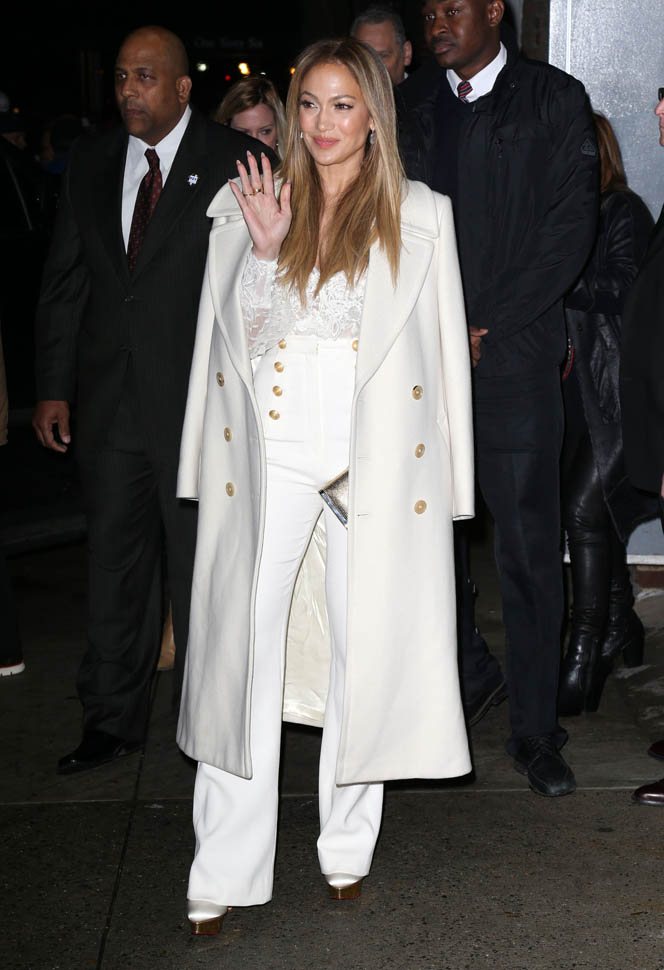 Check out JLO in white on her way to and from her promotional appearances. The outfit works better with the coat draped over her shoulders. Because it hides that janky white lace blouse.