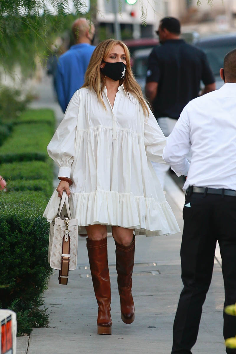 As for JLo – it’s a pretty belted white dress but the main event is the footwear. And while my own style lane is closer to Emme’s, I can’t deny the excellence of these boots. That shade of brown is gorgeous. That’s a perfectly shaped toe and a perfectly shaped heel. The platform is just right. I don’t often love a knee-high but the knee-highs I’m most drawn to are the ones that aren’t painted onto the calf, but go straight up instead of narrowing around the leg, which is what JLo’s are doing here.