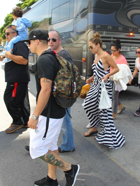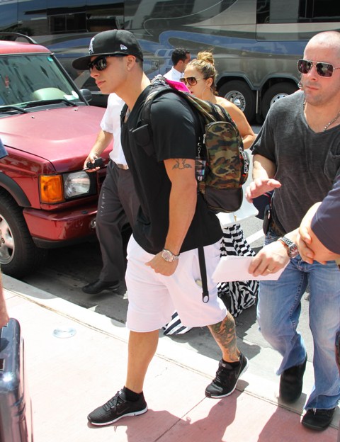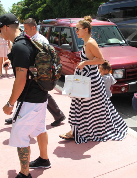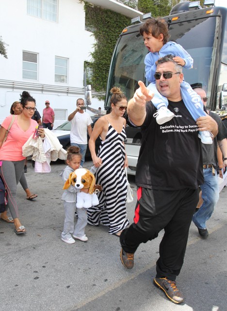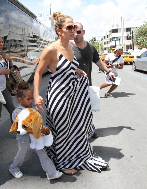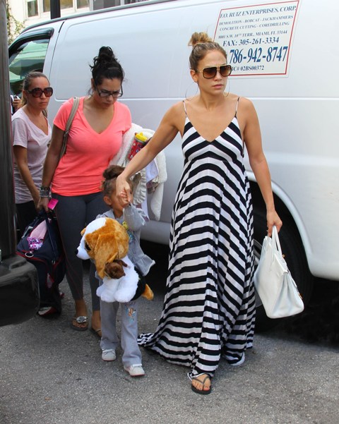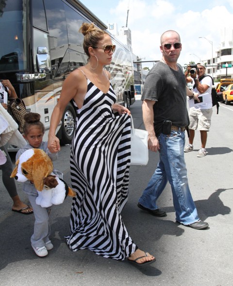 Jennifer Lopez’s tour stops in Miami this weekend. Here she is arriving at their hotel with the children and the entourage and the boyfriend, the back-up dancer turned “head choreographer”, and why isn’t he her fiancé yet, Casper Smart. Seeing his hand on her back is grossing me out. Is that unfair?