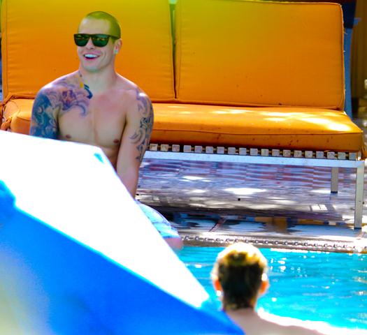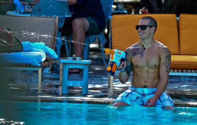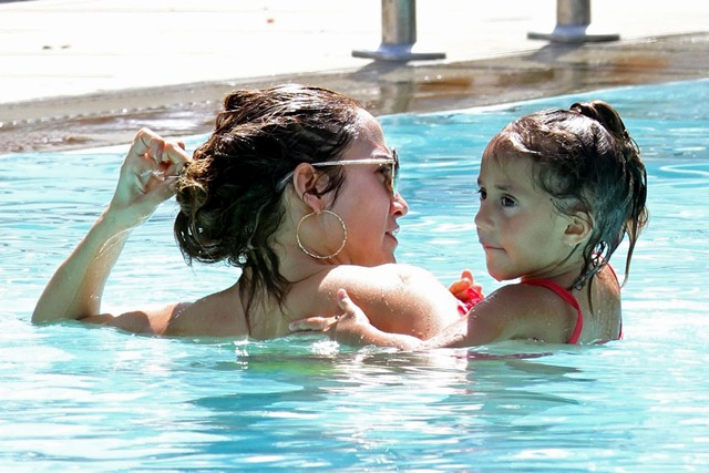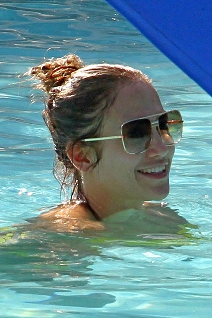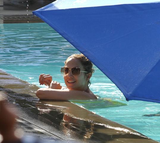 Here’s JLo Bear with her kids, the bodyguards, the nannies, the entire crew, and Casper Bear hanging out in the pool at her hotel in Miami. The pool is a big deal for people when they pick their hotels, isn’t it? I always overhear people asking -- is there a pool!?!? Me I never consider it. Not just because I’m travelling on business most the time but because, I guess, the pool is a family thing with the kids and the fun and finding a way to kill a few hours. It seems like a place where there would be a lot of shrieking. How can there not be shrieking when there are water guns around?