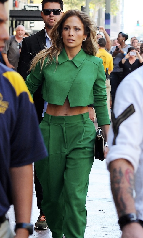 Here she is arriving at American Idol yesterday in a cropped top green pantsuit that probably only works on her and Beyonce.