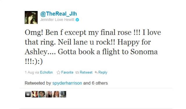 I don’t watch The Bachelor or any of its iterations. Never. So I don’t know who these people are. Apparently JLH does. And she’s been throwing herself at one of them. Some guy called Ben. He’s a winemaker. (Please, I do appreciate that you’d want to fill me in. But I assure you this is all I’ll ever need to know about Ben the Winemaker. Save your email and yell at me about something else.) And though he didn’t win the competition, JLH clearly though that he was the best candidate, tweeting: