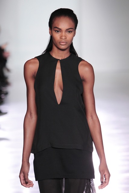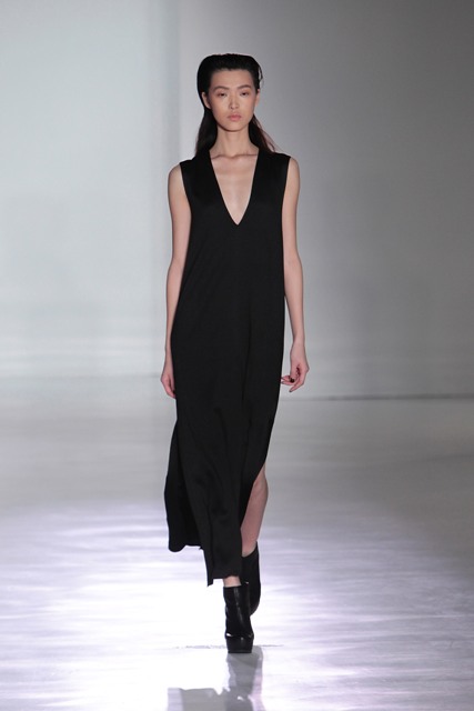 Black, white, and clean lines. Really into the straight black sleeveless dress with the deep v and the side cut leg.