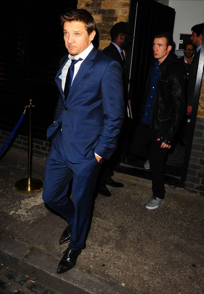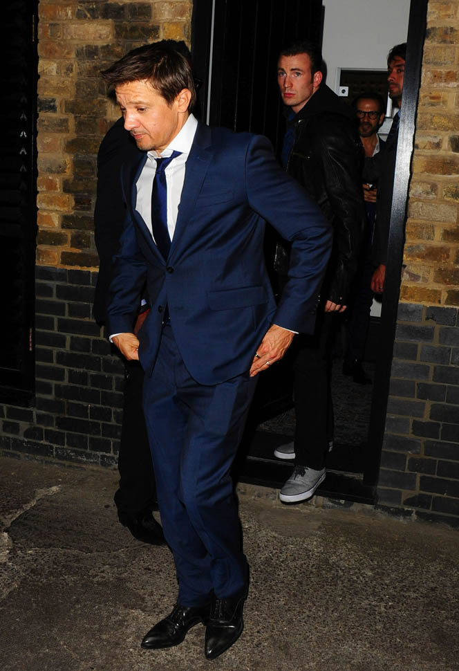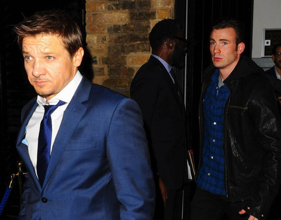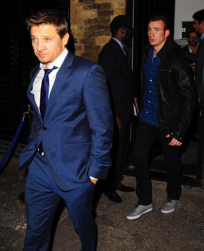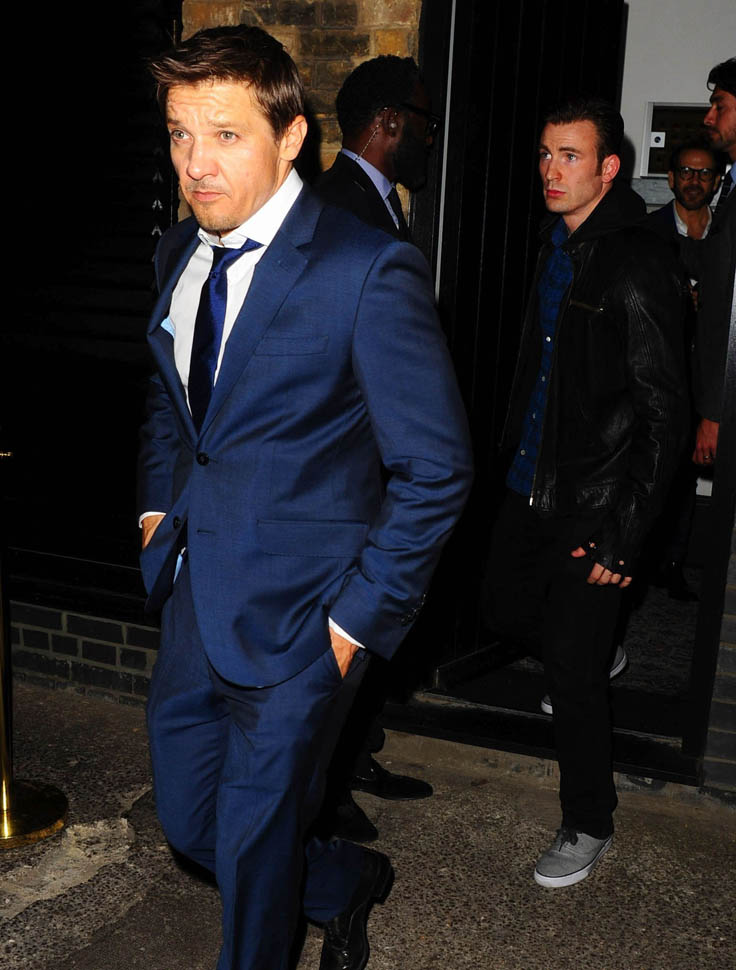 Chris Evans and Jeremy Renner were there on Thursday. Captain America and Hawkeye. Friends off set. Partying together after working on Avengers 2 although I don’t know why one’s in a suit and the other isn’t. Is that important? What I care about is the friend grouping. Like when he wants a parent-kids day, Renner rolls with RDJ at the zoo. When he’s down for a night with the boys, Renner calls up his boy Chris Evans.