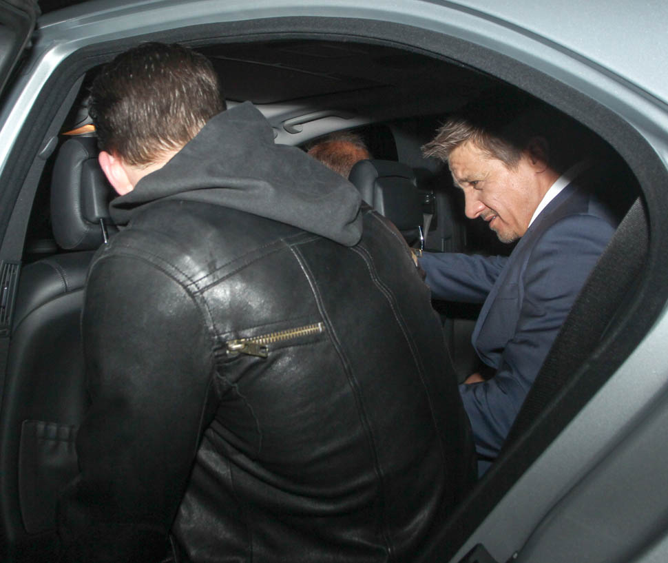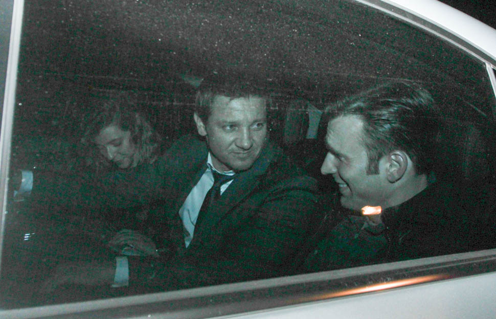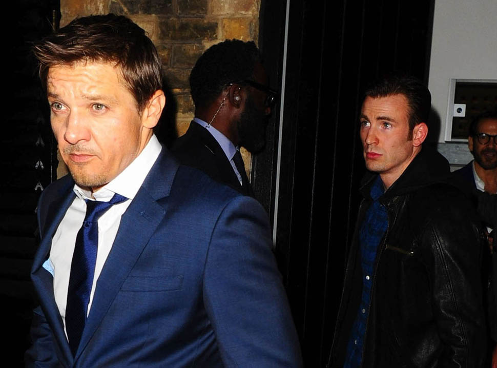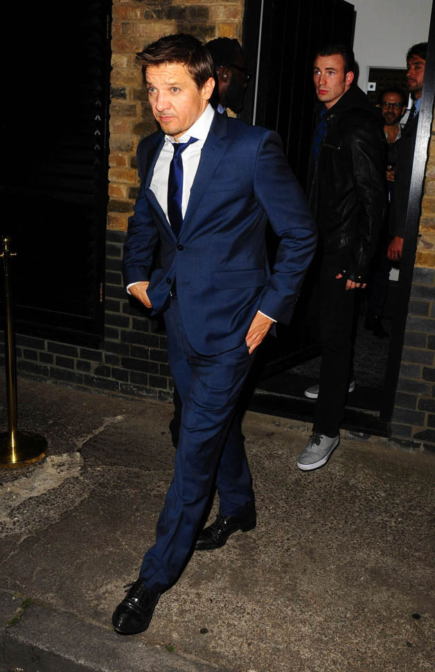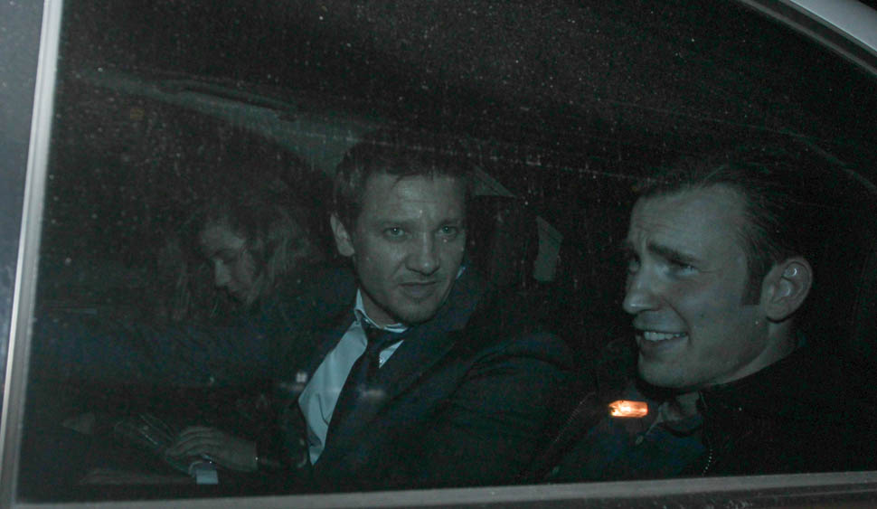 Chris Evans and Jeremy Renner were there on Thursday. Captain America and Hawkeye. Friends off set. Partying together after working on Avengers 2 although I don’t know why one’s in a suit and the other isn’t. Is that important? What I care about is the friend grouping. Like when he wants a parent-kids day, Renner rolls with RDJ at the zoo. When he’s down for a night with the boys, Renner calls up his boy Chris Evans.