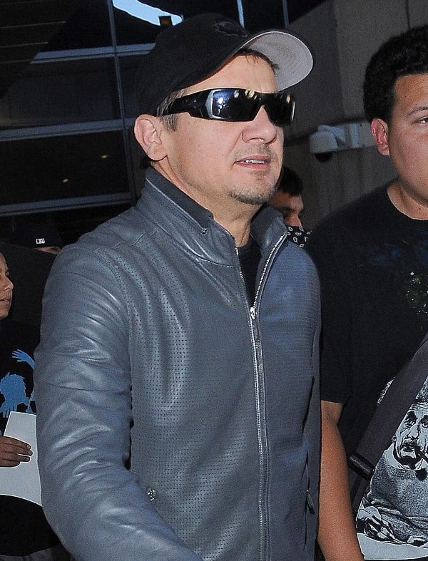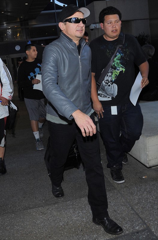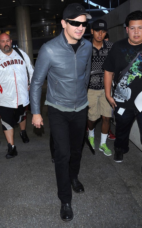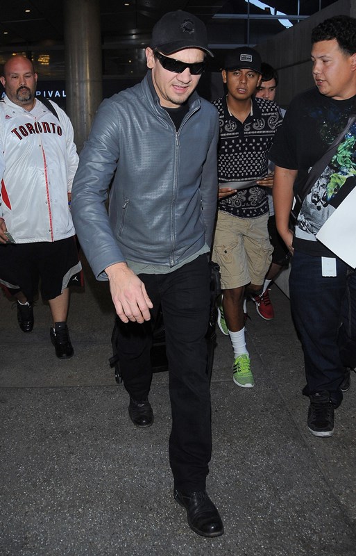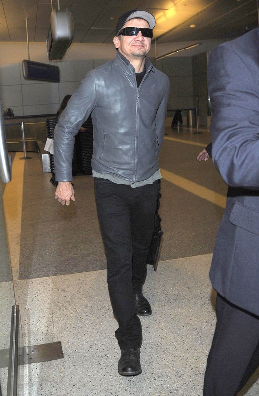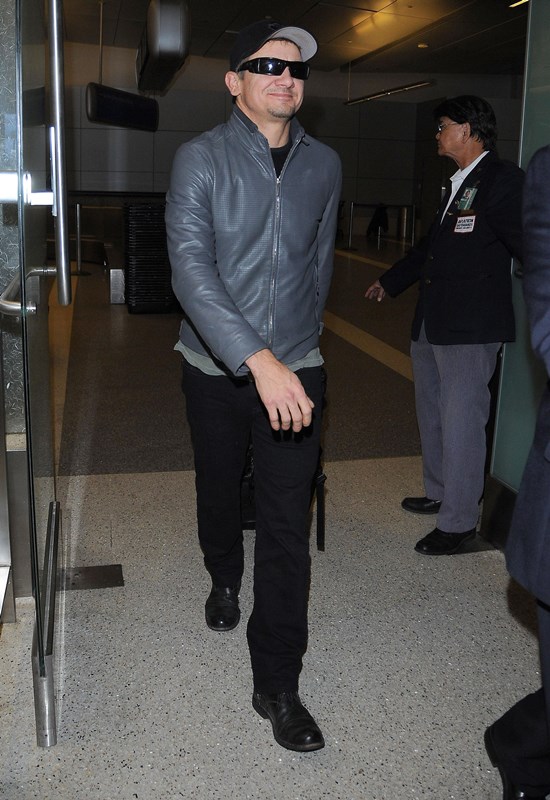 Jeremy Renner has been in and out of London all year. Avengers: Age of Ultron filmed there over the spring and summer, and following that, he’s been there working on Mission: Impossible 5 – Presumably There’s A Bomb throughout fall and winter. Here he is once again at LAX over the weekend; not sure exactly where he’s coming from, but London is a logical guess. This is the difference between Single Renner and Family Man Renner—he makes a lot more trips home.