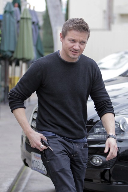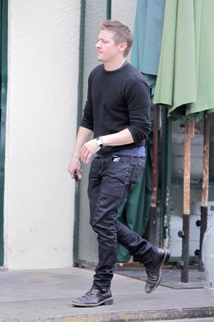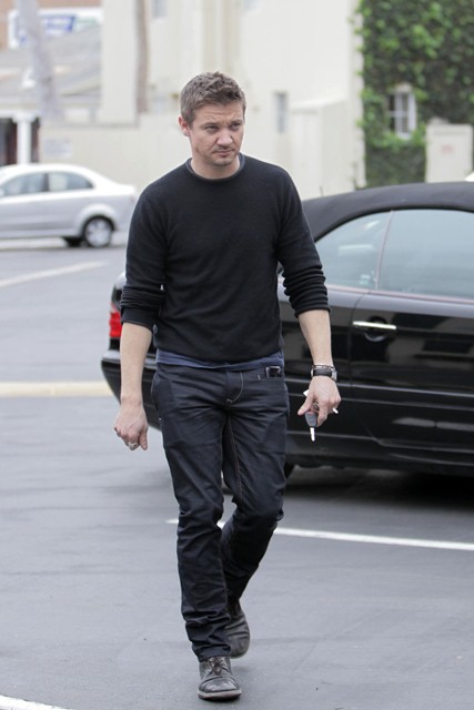 Have mentioned before that as hot as Jeremy Renner was in The Hurt Locker, it’s just not the same out of character. But yesterday, shot in LA, there’s something, non? VERY well worn pants. Good hair, rugged profile... it’s working. It’s working a lot.