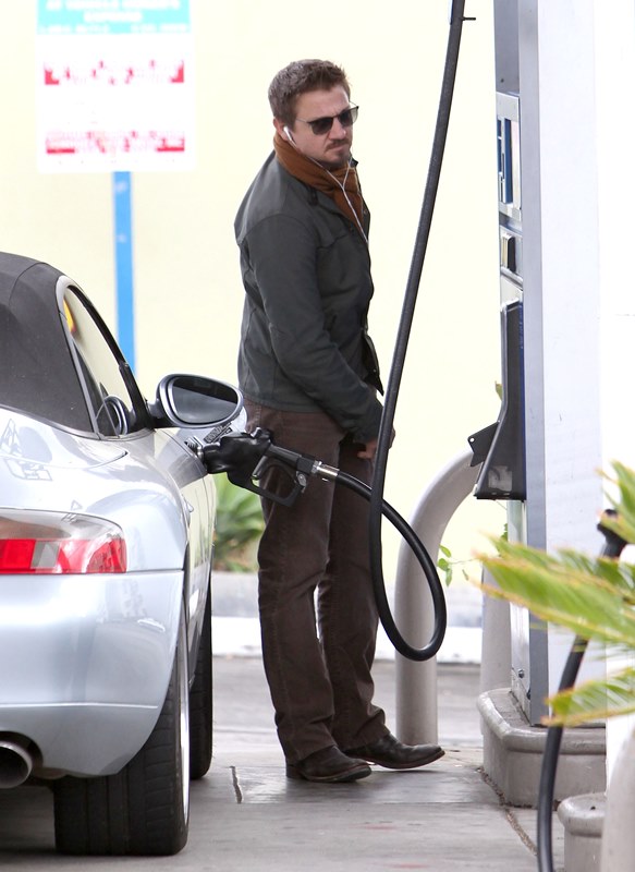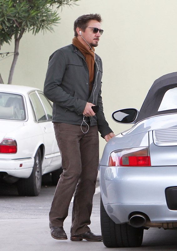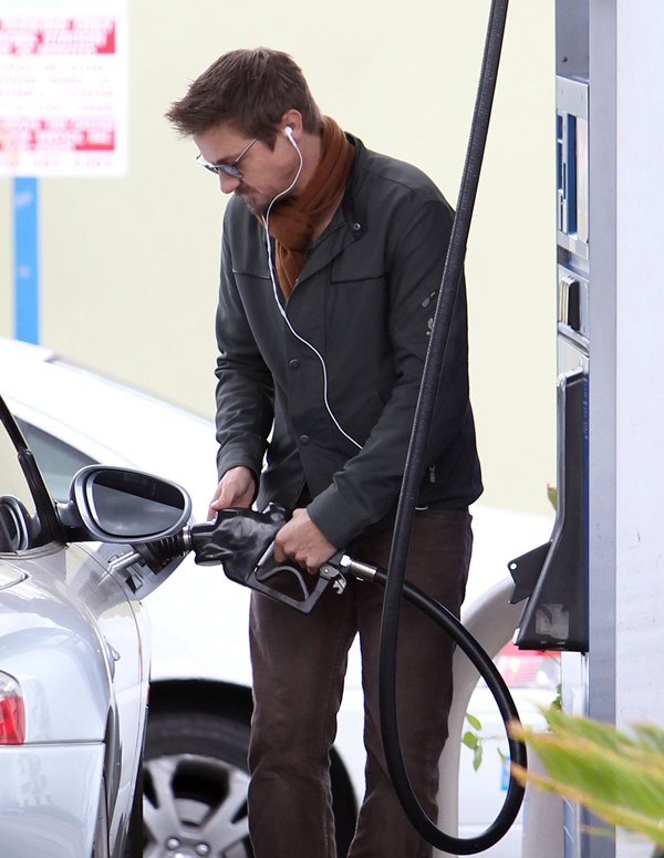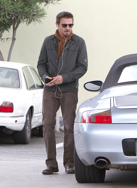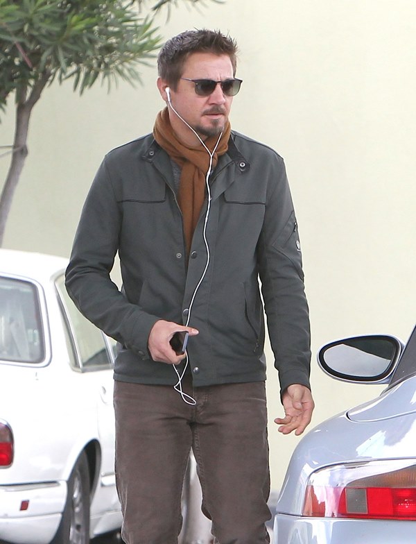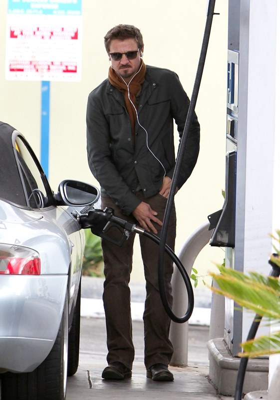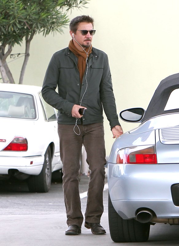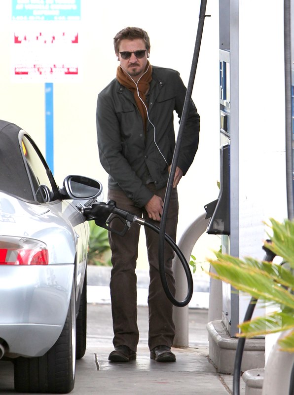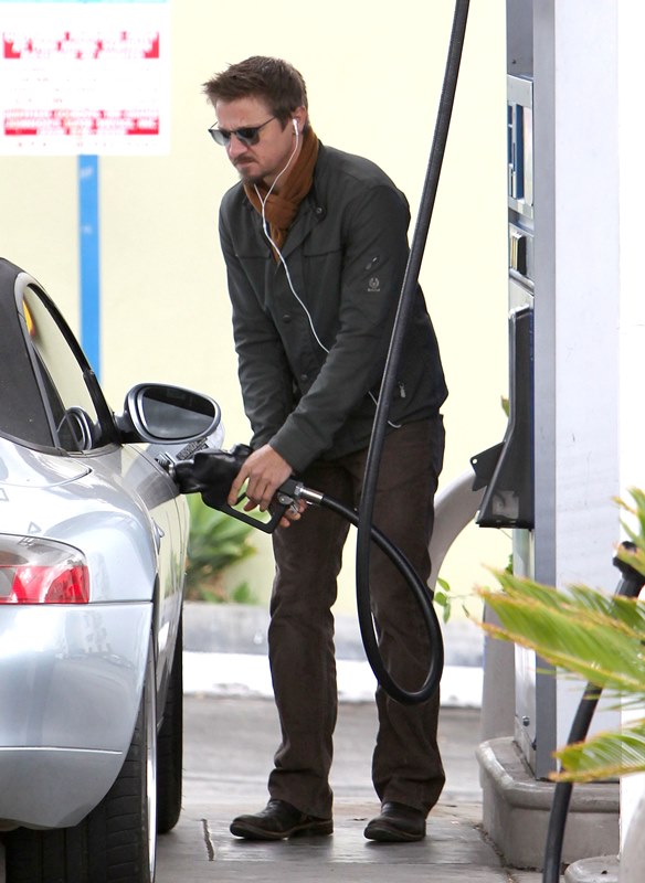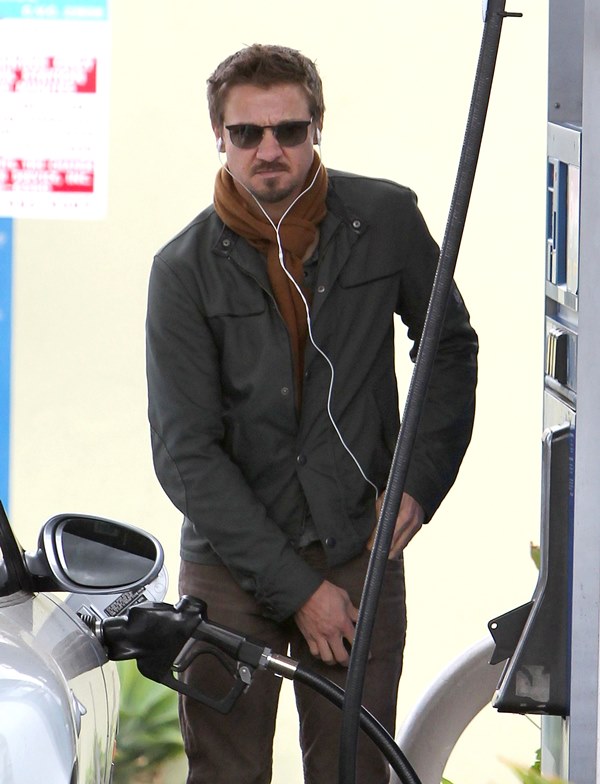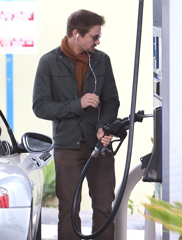 Jeremy Renner was wearing a ring last week at the Hollywood Film Awards. Click here for a refresher. I reported at the time that I’d received an anonymous tip that I couldn’t confirm with a secondary source about how he’d supposedly married Sonni Pacheco, something to do with an expiring visa. Renner’s people don’t make it a habit of confirming or denying rumours so that’s not been particularly helpful. But when he stepped out yesterday at the gas station, there was no ring. Is the ring not a thing, or does he just not want the heat?