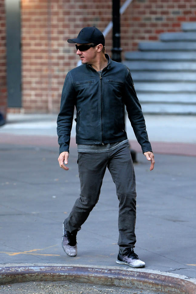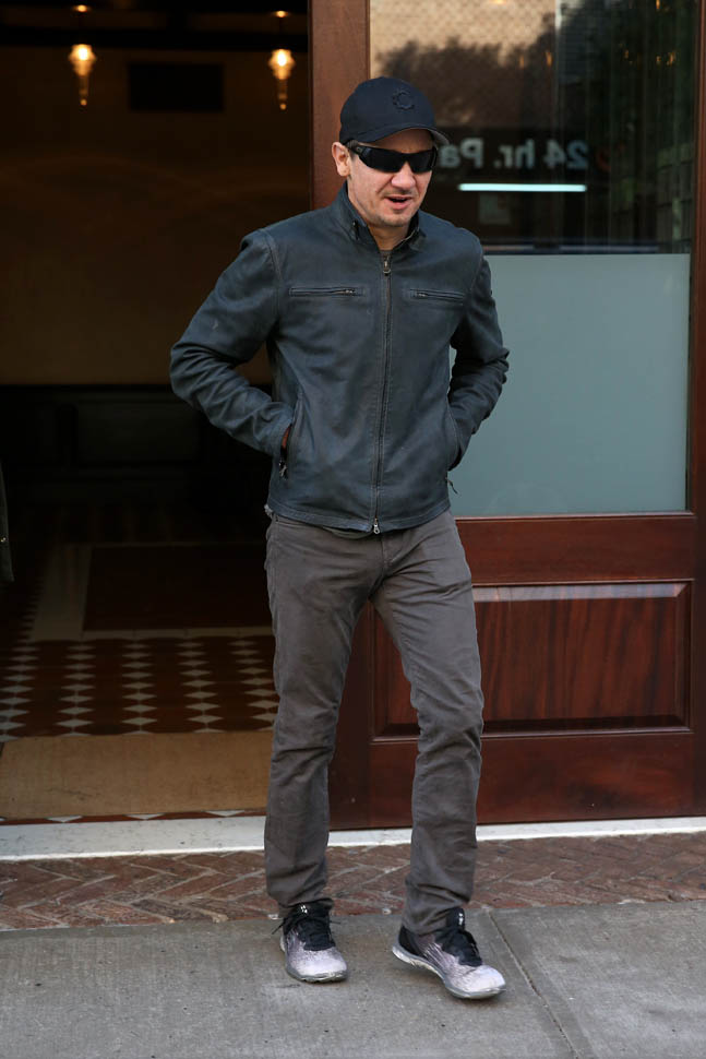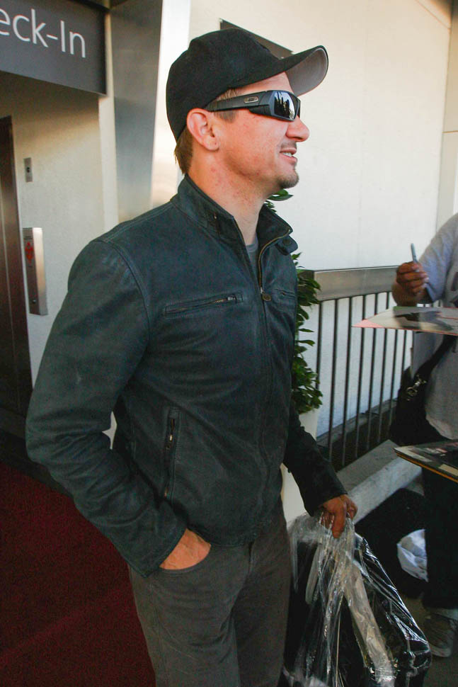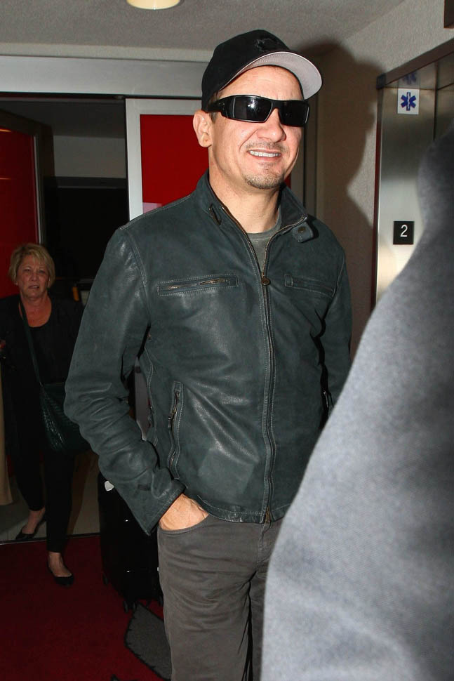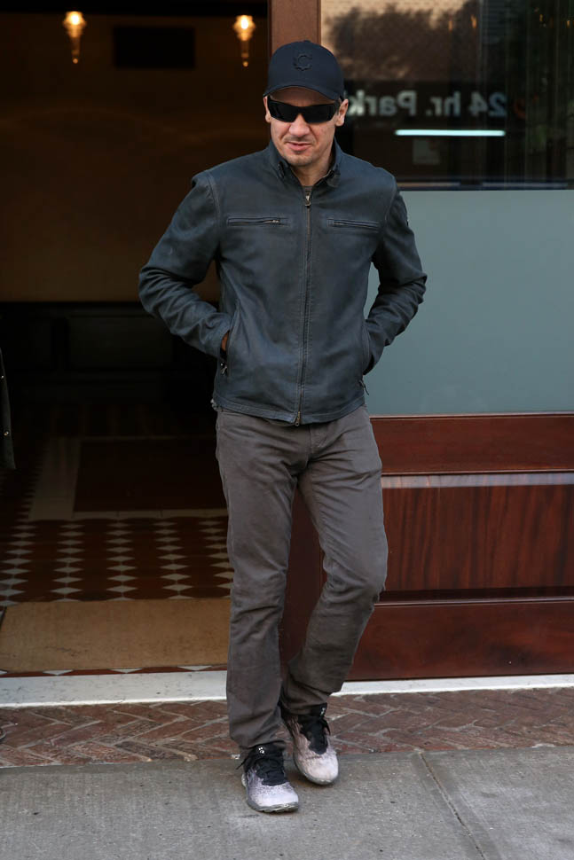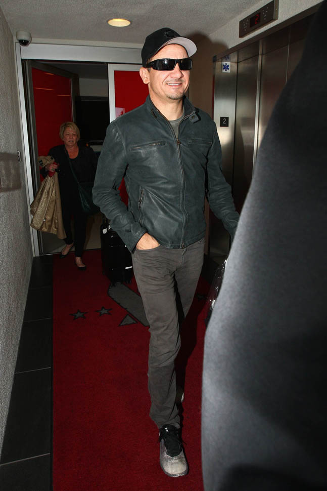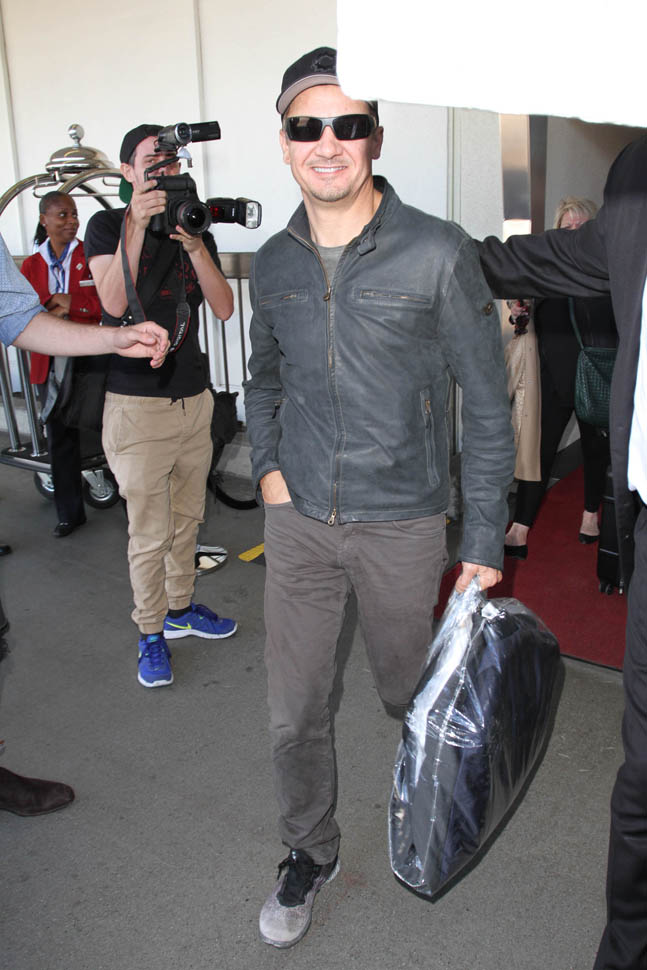 Attached – photos of Renner yesterday in New York and then arriving back in LA.