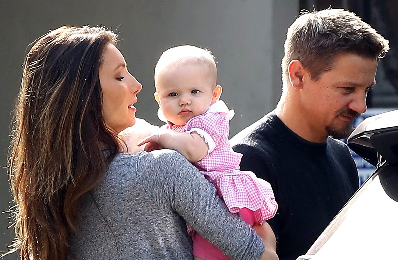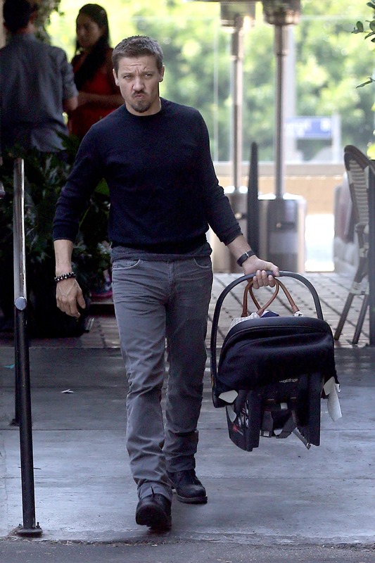 Jeremy Renner was out yesterday in LA with Sonni Pacheco and their daughter Ava Berlin, 5 months. Ava is chunky and cute. I can’t see either one of her parents in her face yet. OK maybe there’s a little of her dad in her eyes?