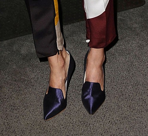 I love the pants, am intrigued by the purple satin shoes (in that I don’t actually mind them at all), and hate, hate, hate the nails, specifically the polish colour. The first problem is the sparkle. And then copper/gold sparkle? GROSS.