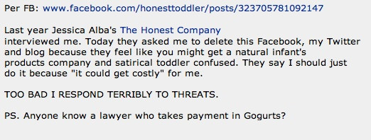 This morning, many readers wrote in about a mini social media sh-tstorm when The Honest Company sent a letter to The Honest Toddler, a satirical blog written from the perspective of a child. If you spend 10 seconds on the blog, it’s clear that it has nothing to do with e-commerce or eco-friendly baby wipes.