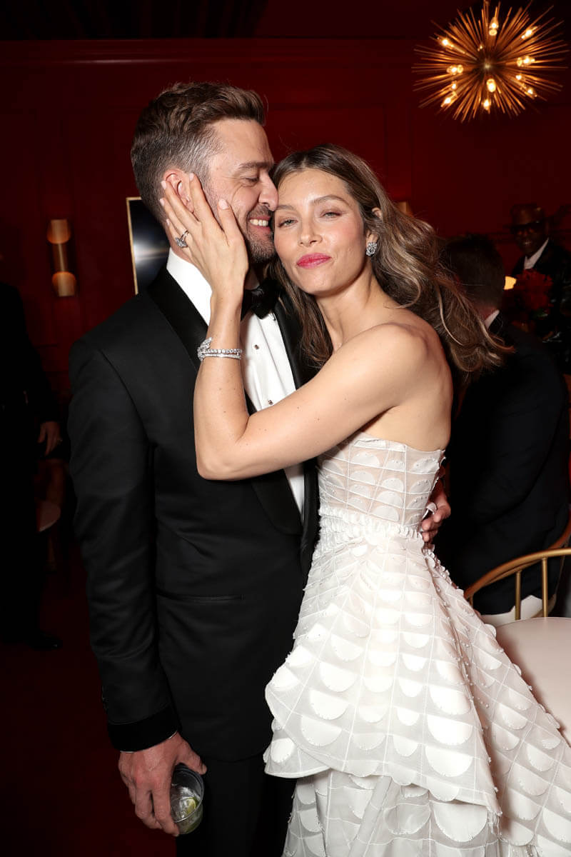 Here are Justin and Jessica at the after-party. I prefer the white dress she wore to the show. God she looked beautiful last night. Love the lightly waved hair. That shade of dark pink looked great on her lips. She is stunning. And you never get a chance to appreciate it because there’s always a punk tap-dancing like a monkey beside her.
