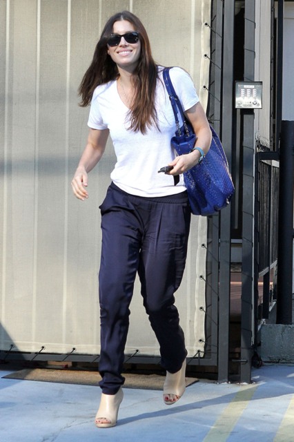 Jessica Biel was photographed leaving a meeting yesterday in Hollywood. I like the pants. She looks good. And lean but not as skinny as she’d become last year when she seemed to be forcing her body into the form that’s been assumed by so many of her contemporaries, forgoing the tight, athletic build for which she’d become famous.