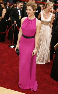 I’m sorry… I don’t mean to mean. I’m sure she’s lovely. I really do think she has a lovely bum. But…um…like… what’s with the recent overkill? A movie that died at the box office, in which she was hardly remarkable, and weekly photos of her showing off her muscles at the beach, and all of a sudden JT is tapping that ass and Oscar wants a presenter? I’m telling you – it’s the Paris Hilton factor. It’s because she lowered the standards for everyone. And a girl like Jessica Biel is opportunistically reaping the rewards under the brilliant guidance of her agent. But here’s what’s vexing me: do you remember what she wore to the Oscars??? Do you remember the atrocity??? Do you need a refresher? The fuchsia, the crimped hair, the hermified muscles popping across the carpet? What do we think of a Best Dressed List that included her on it? What does that say about any Best Dressed List that chose her dress as one of the evening’s finest? Can we really trust People Magazine? Especially when they listed Cate Blanchett BEHIND Jessica Biel??? …tha f&ck? And it gets worse. The same girl who made the colossal mistake of wearing THAT to the greatest honour of her life was somehow seated front row at the Stella McCartney show today…and after only 3 minutes, she had to be excused, committing a huge fashion faux pas in front of a very particular Parisian audience. The official word is that she fell ill. Why she chose to fall ill after the runway was already occupied is beyond me. Clearly more drama to this girl than originally thought? I have a feeling it’s only the beginning… which I suppose isn"t surprising, considering she"s famouse these days, really, for doing nothing, why expect her to actually WORK to earn some status??? Source