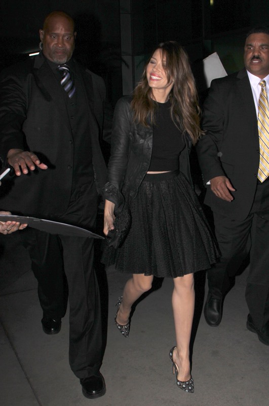 As you can see, Mrs T looked lovely in a crop top under a black leather jacket with a knee-length skirt. SO pretty. Because her face is pretty. And it’s nice to see it not hidden under that f-cking fringe.