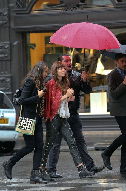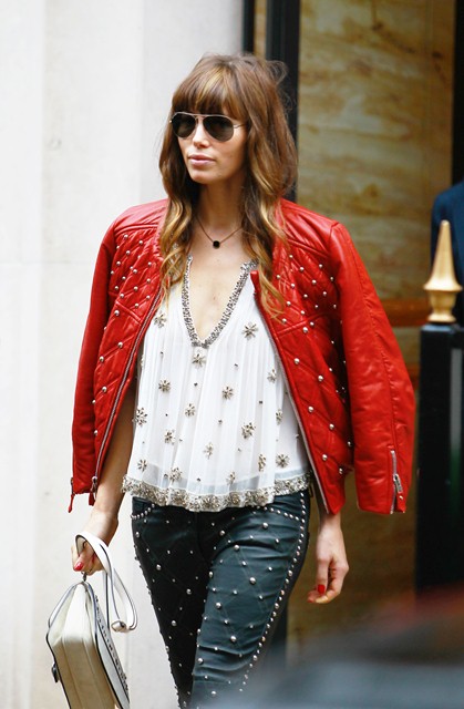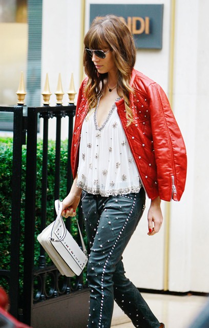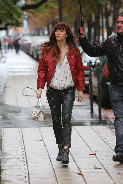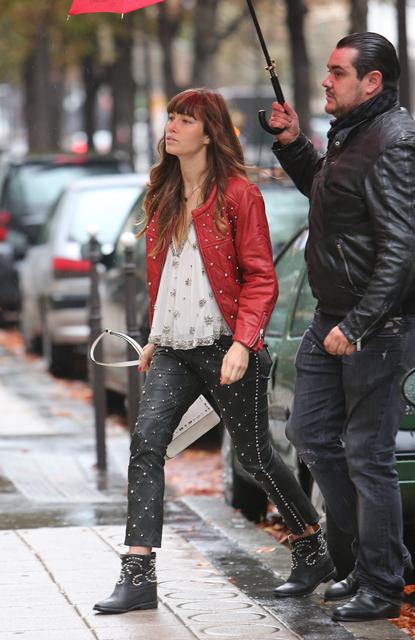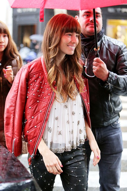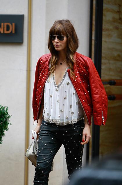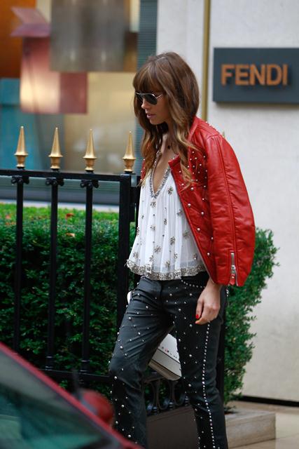 With a couple of weeks to go before the wedding, Jessica Biel spent the weekend in Paris for a photo shoot. Today she stepped out to go shopping on Avenue Montaigne. As you can see, she’s wearing those leather studded Isabel Marant pants which juuuuust appeared on the runway at PFW last month. Click here to see the collection. I noted when I posted it that celebrity stylists would be calling right away about these pants. And it appears that Shelfy won them before anyone else. All of it, in fact, looks like Isabel Marant fresh from the showroom, months before civilians even have a hope of sniffing at it, and definitely before Kate Bosworth which… well… Kate Bosworth’s fiancé isn’t Justin Timberlake, is he?