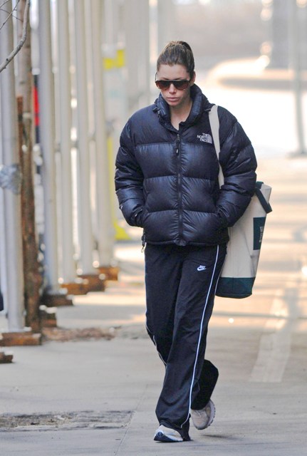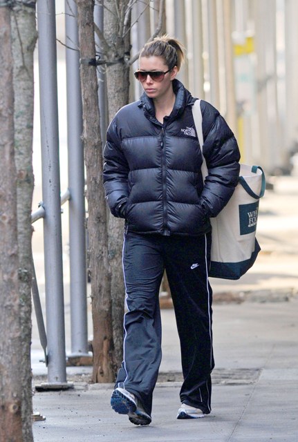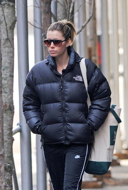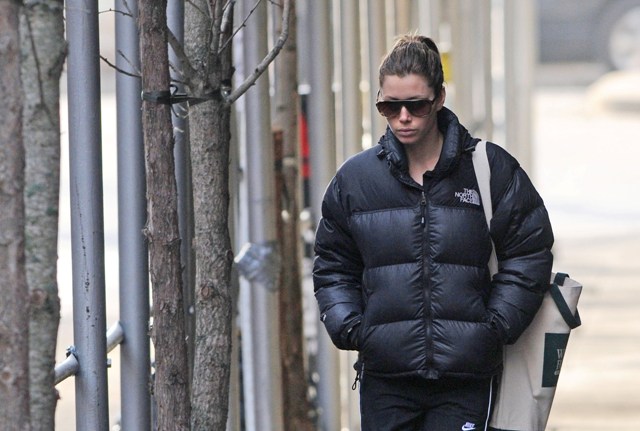 Attached – Jessica and Justin Timberlake leaving the gym yesterday in New York. He’s been promoting his reality tv show The Phone. We will TOTALLY rag on that sh-t closer to the premiere. More impact that way.