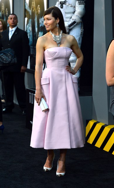 Here’s Jessica Biel last night at the premiere of Total Recall. It’s what I call aspirational dressing. And, curiously, her sartorial approach mirrors her professional one. The Jessica that Jessica wants to be and the Jessica that Jessica actually is, they are not the same. What you see here, this dress and the shoes and the accessories, while certainly a beautiful idea, it’s not the right idea for Jessica Biel. Marion Cotillard? Of course. Rachel Weisz too. Jessica Biel? You can’t force a look on a person who can’t carry the look. She can’t carry the look.