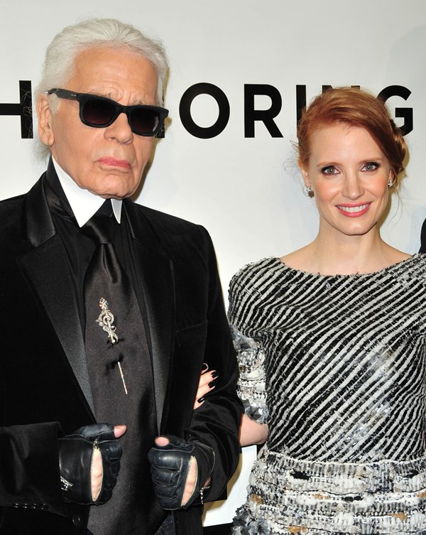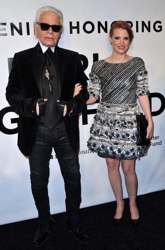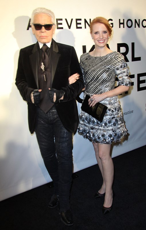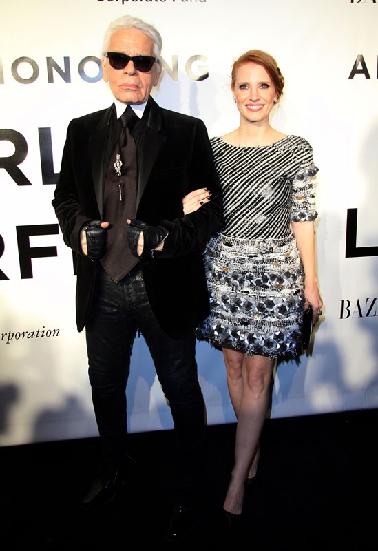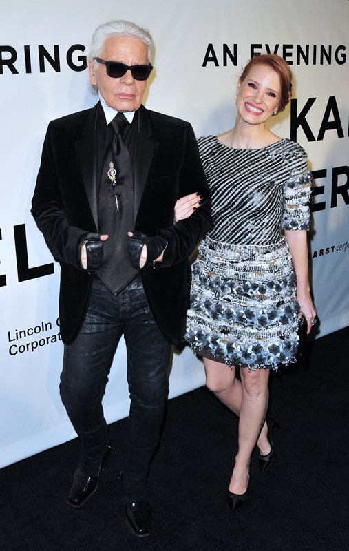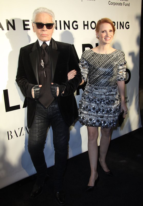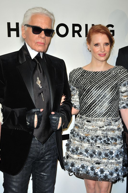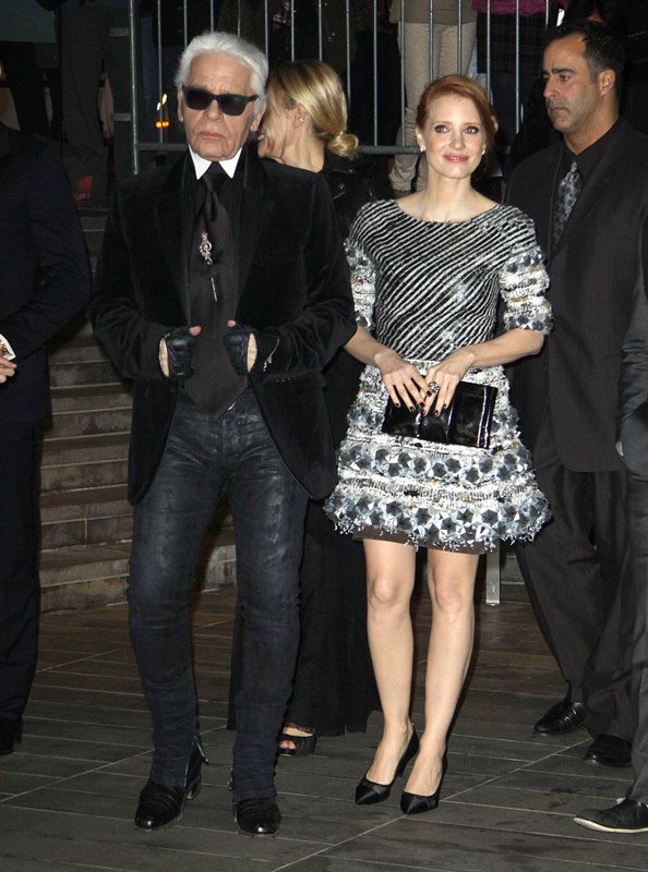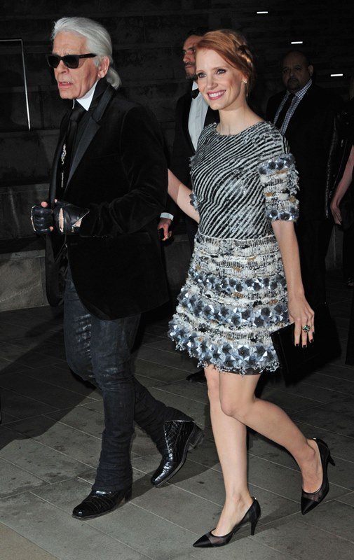 Karl Lagerfeld made an excellent choice in date last night at an event where he was honoured. And of course, she wore Chanel. It’s a beautiful dress. But how do you feel about the diagonal stripes? Would you like it better if they were horizontal? I think I would.