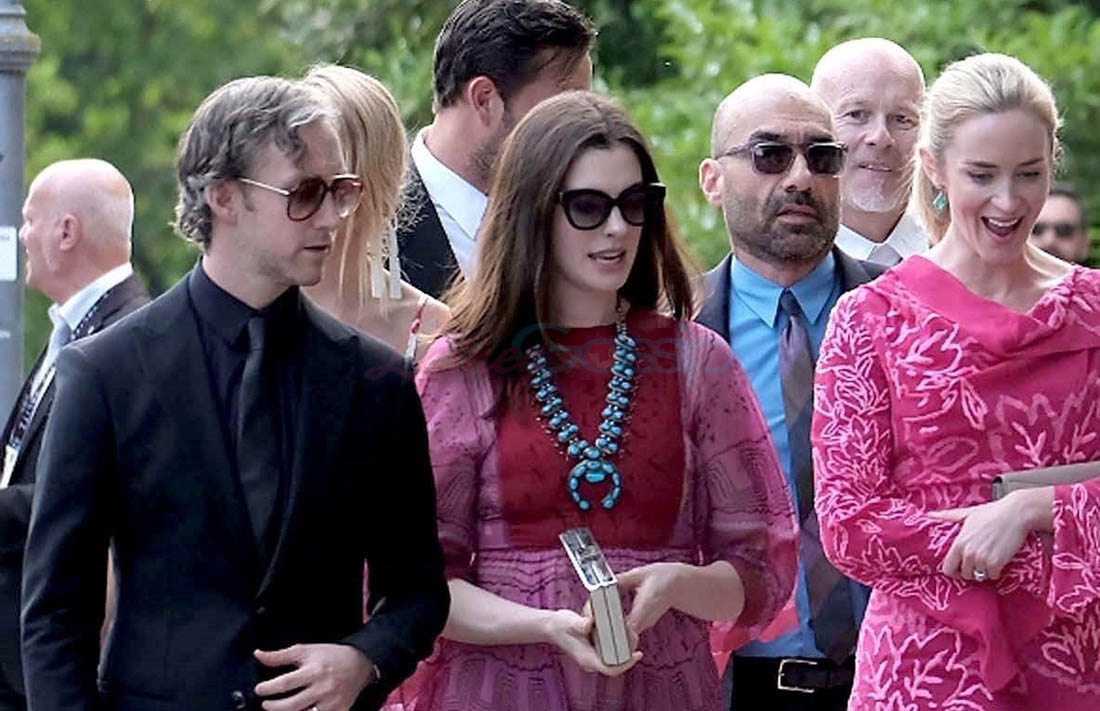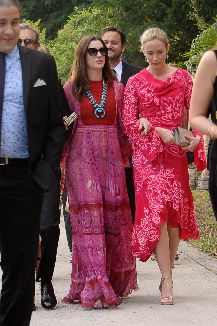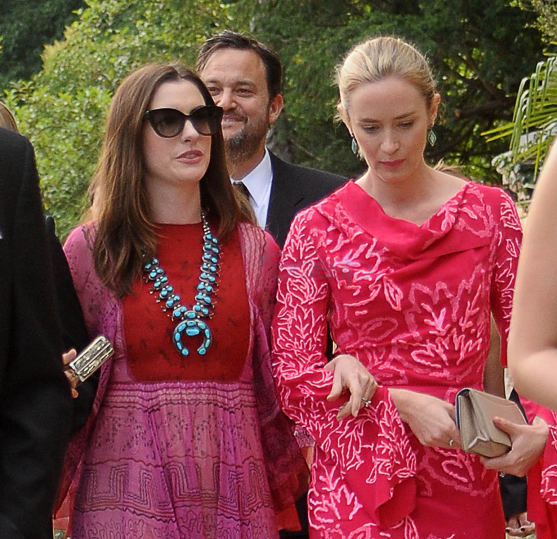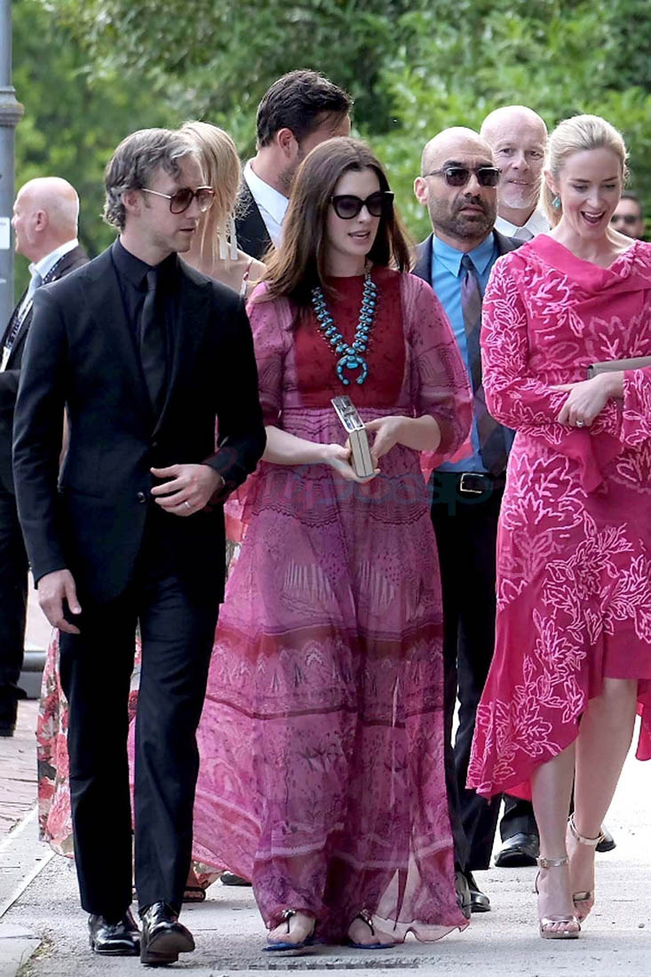 Also attached – Emily Blunt and Anne Hathaway, with her husband, Adam Shulman, attending Jessica’s wedding. Emily and Annie, of course, are close from The Devil Wears Prada. Annie and Jessica worked together on Interstellar. Emily and Jessica were in The Huntsman together. With Charlize Theron.