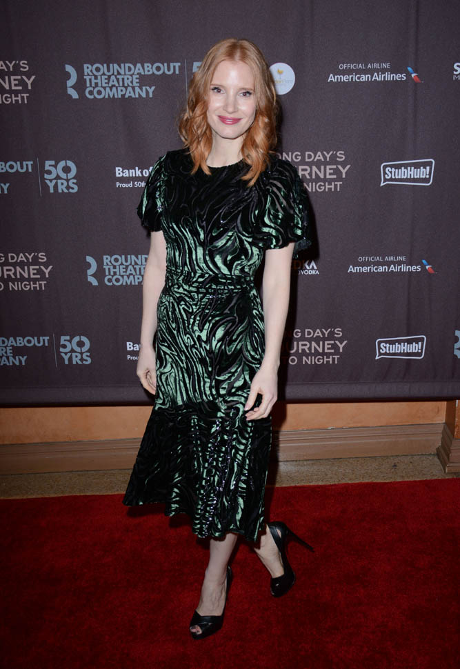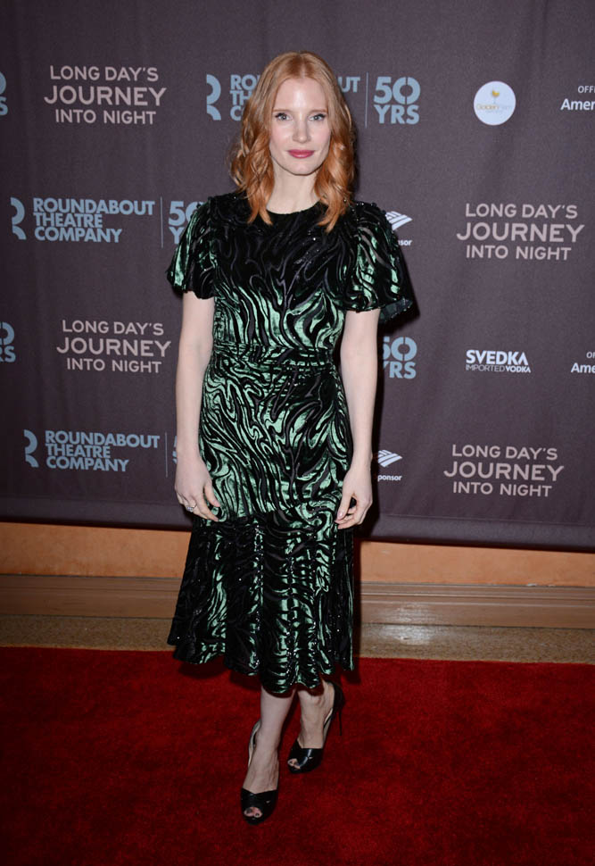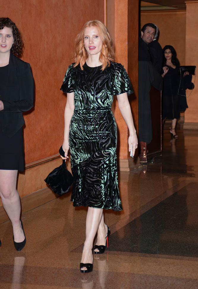 Rich. That’s the word that came to mind when I saw this dress on Jessica Chastain. Rich green. Such a luxe green. To me it looks like crushed velvet. Which adds to the decadence of it. And it’s glorious. It’s such a great cut on her. Those sleeves too? SO good.