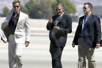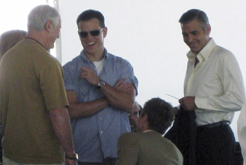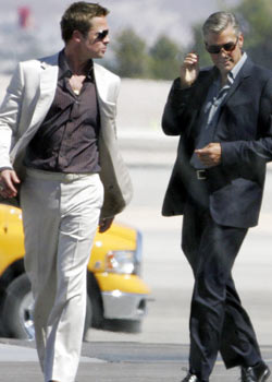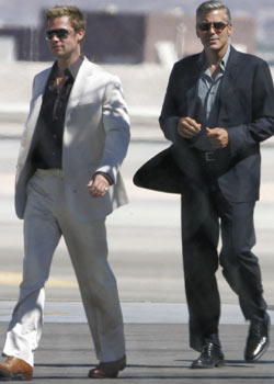 Holy Mother of Loin Quivering Hotness. It"s too much. It"s much too much. Brad, George, Matt - Matt who normally doesn"t bring the quiver - I"m lightheaded, I"m dizzy, I"m swooning, I.Can"t.Get.Enough. Again, the costume designer for this movie deserves our endless recognition. Or at the very least, a Jessica Simpson fellatio special. Because this sh*t is lethal. This sh*t will cause you several hours at work. Caution, gossips. And yes…I am thisclose to bringing back Brad for the Freebie 5. Or maybe Brad + George, sideways on a raft, with nothing but the sun to warm their skin. Brad Pitt. It appears I just can"t quit him, can I? Photos source