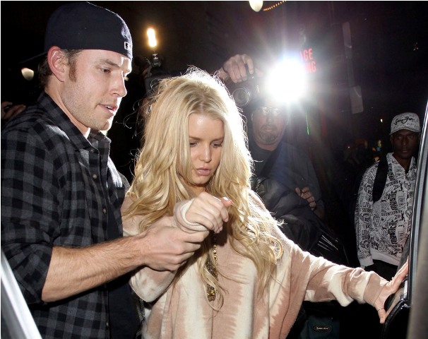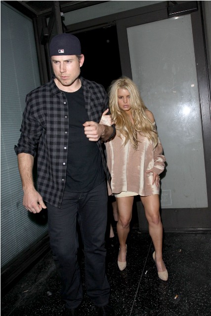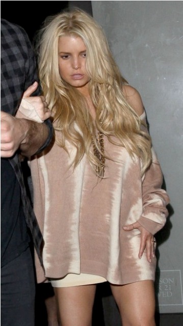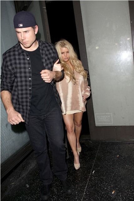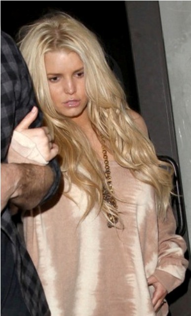 Porny Jessica Simpson took her freeloader out for dinner last night. They went to Katsuya. Too much sake? He had to hold on to her to make sure she didn’t bail on those heels. But that is a crazy weave, non? And it’s actually not that bad either, comparatively speaking. Hers for example is far superior to Lilo’s and Fried Chicken Britney’s.