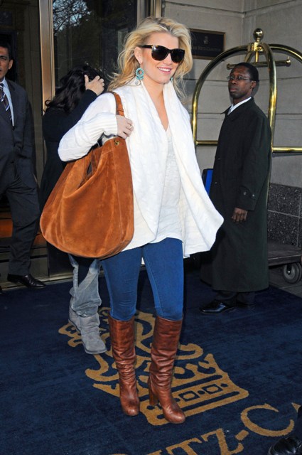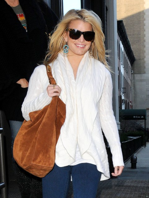 Here’s Jessica Simpson in New York yesterday looking very good in jeans and boots and a white wrap and maybe a little too much bronzer, out and about before watching Ashlee perform again in Chicago and then out for dinner with her later on.