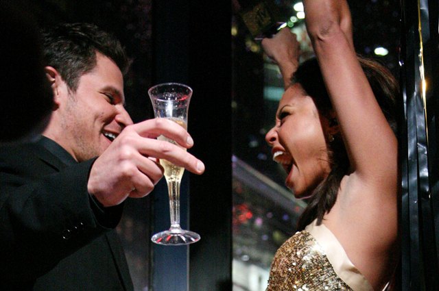 One year later – is this the face of a man who didn’t want to end his marriage? Sorry for the little gloat but at the time of the divorce announcement, when it was widely circulated courtesy of Pervy Joe Simpson that Jessica was the one who pushed for separation at Nick’s resistance, I reported that HE was actually the one calling out for months, and for the sake of saving face and to help her play out a “strong woman” façade, he agreed to pretend subsequently coming out on top when it was all said and done. Indisputable – Nick Lachey had a killer 2006. And he kicked off 2007 on MTV with his new Beauty Queen Vanessa Minnillo, clearly incapable of wearing anything non-pageant fashion. Gold and gawdy, she’s gorgeous but seriously…WTF? Apparently there was a lot of whispering, some neck nuzzling, a hug and a kiss – all played out on a raised platform, no less – followed by tears… of Joy, OF COURSE… perfectly practiced for someone with her pageant pedigree. Excessive yes. But I like it. And I particularly like the one of her squealing with excitement at the turning of the New Year. Her game is so convincing, you have to be happy for a man who has found his Miss Sweetly Servile after too many years of enduring Miss Stupid. Source