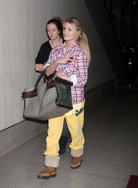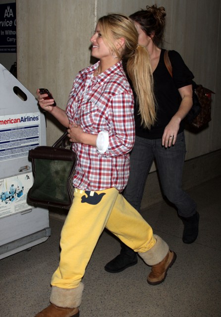 She was photographed in sweats yesterday at LAX with her dog Daisy. In yellow sweats. And here’s another thing: sweats are like pants too. There’s a hot way to wear them. There’s also an illegal way to wear them and Plaxico Burress is a f-cking idiot.