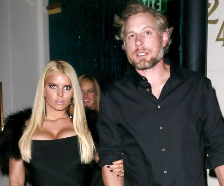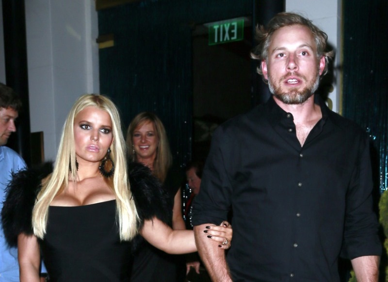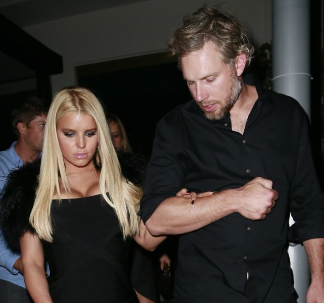 This is Jessica Simpson out for dinner the other night with her freeloader. They were there with Ashlee Simpson, her boyfriend Evan Ross, and Cacee Cobb and Donald Faison. As you can see though, the main attraction was the Tit Shelf. It’s like she’s trying to breastfeed herself. She could very well breastfeed the entire table.