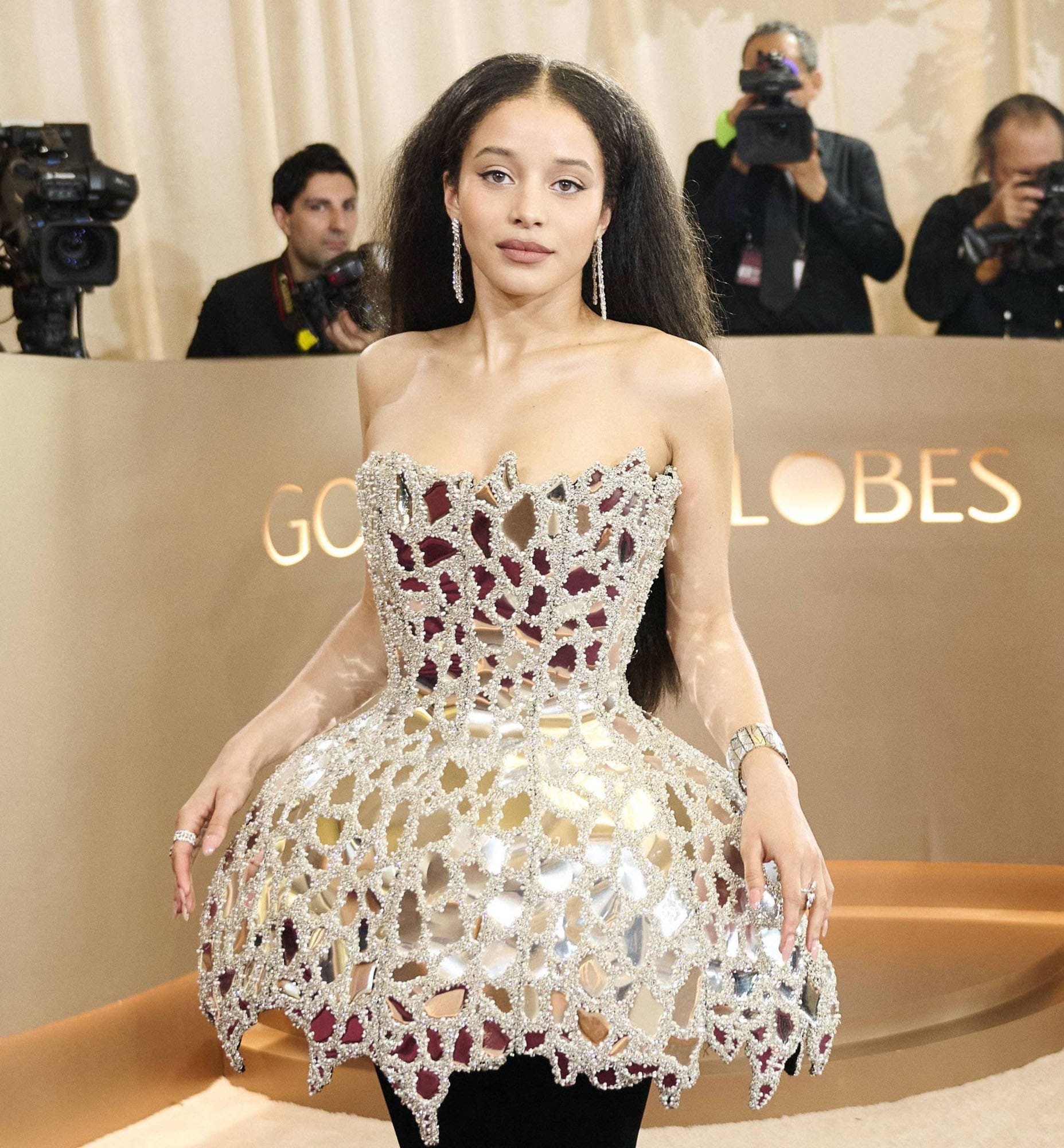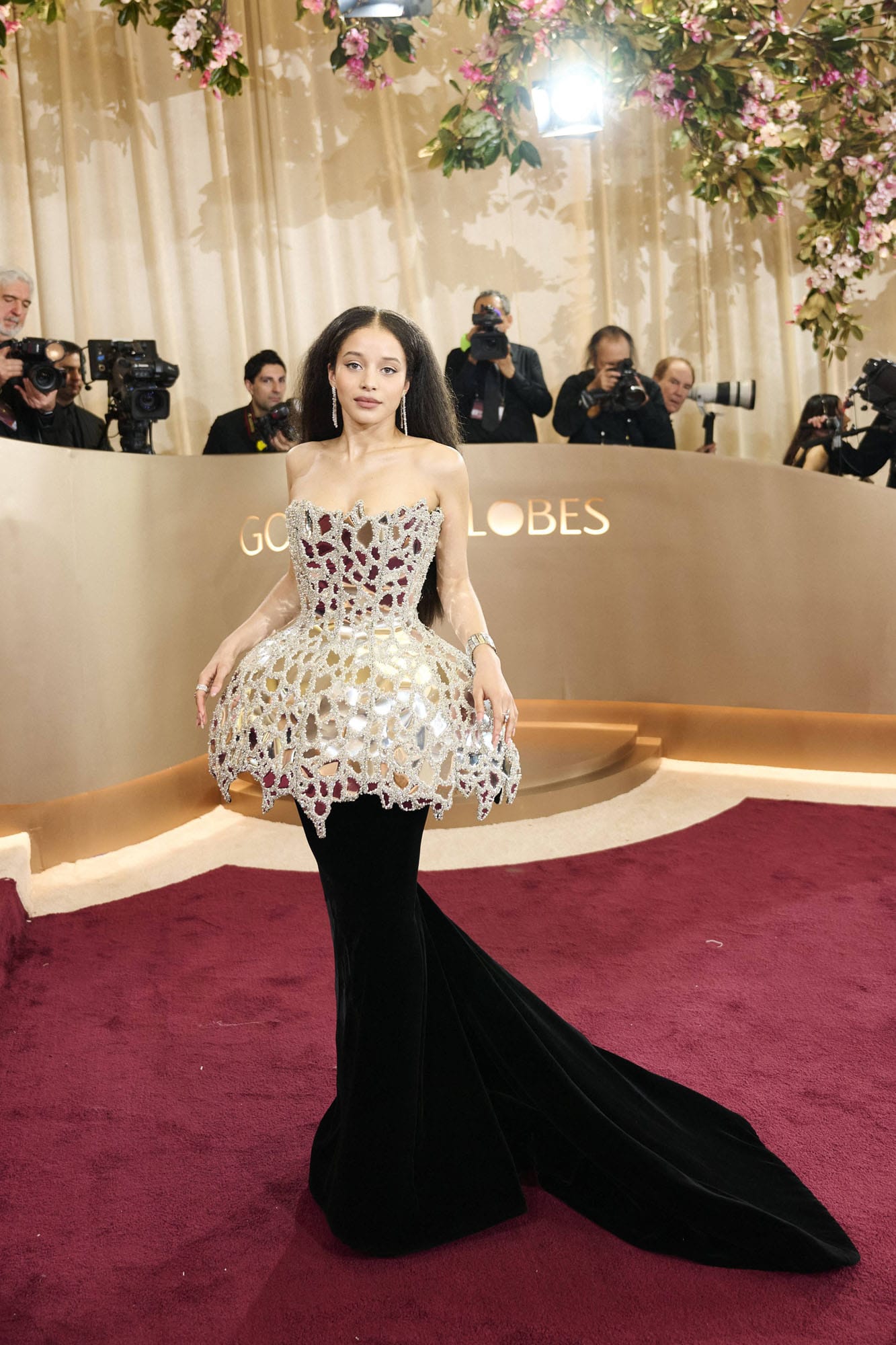 Chase Infiniti, styled by Wayman + Micah, and holy sh-t. The structure of all that cracked mirroring on top would be enough… but then the velvet skirt underneath? They said bring the Met Gala to the Globes and SHE DID.