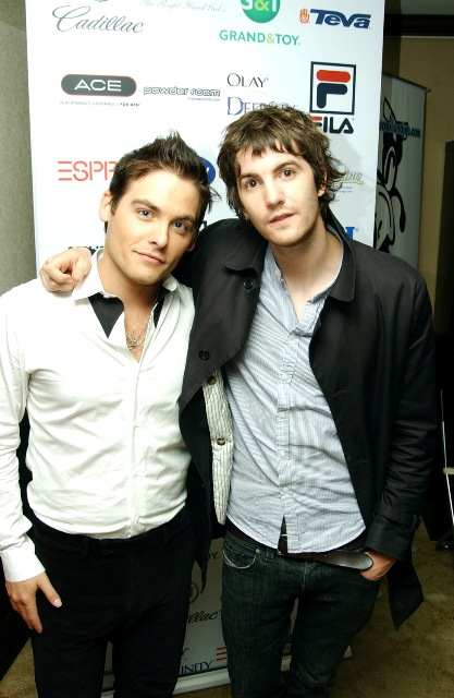 Scott Speedman, seen here posing in front of the Wall of Heroes for Big Brothers and Big Sisters, Sophia Bush who took home a Hero Necklace, and … sigh… Jim Sturgess with Kevin Zegers. Jim left the lounge with some Cookie & Joe tiny tees for his nieces and/or nephews. Another article on Jim to follow shortly.