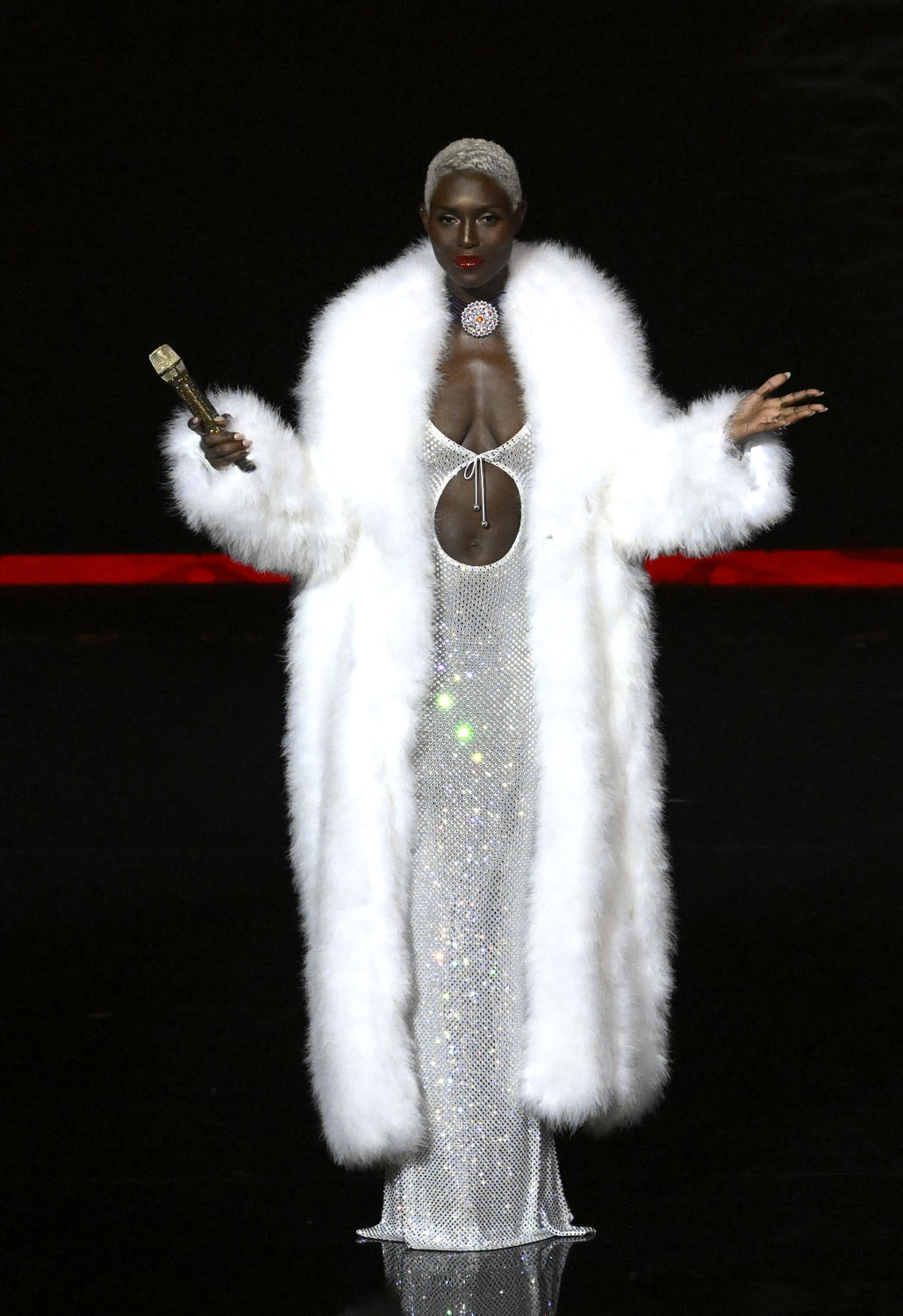 And here’s Jodie in another white look – a fur coat over a shimmering dress: