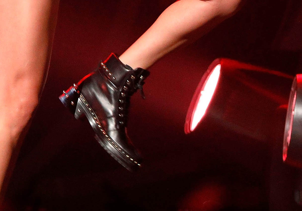 As I noted last month about her reputation style, it’s been oversized on top, a lot of leg, and combats. A variety of dope combats. The black studded ones she wore for the NYC performance are my favourite. But the red velvets in London are sick too.