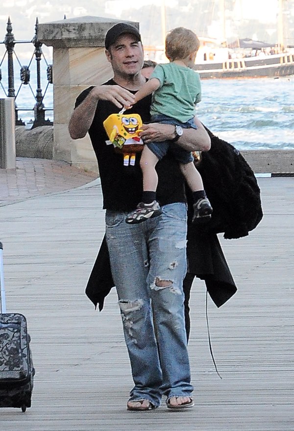 John Travolta and Kelly Preston are in Sydney, Australia today for the Qantas gala. As you can see, he persists with that singular patch of black spike on his chin, leftover perhaps from all the follicle regeneration they performed on his head, like a lonely piece of sod that, for some reason, got separated from his family, looking forlornly at the lawn that grows in solidarity while he’s stuck between two pieces of sidewalk. The upside? At least he gets to be closer to the food.