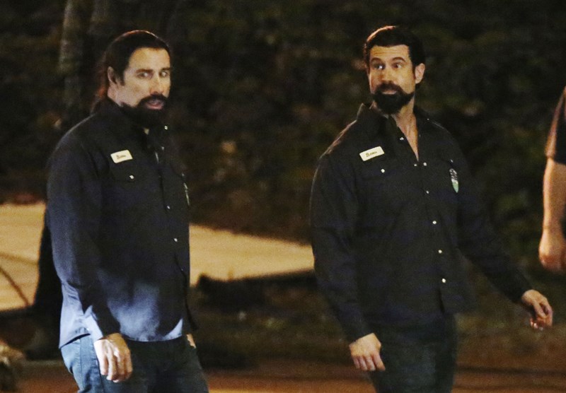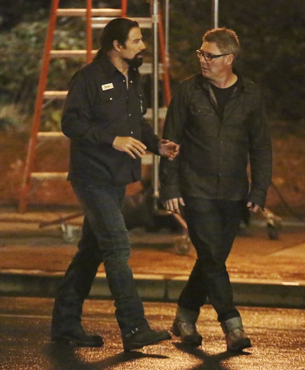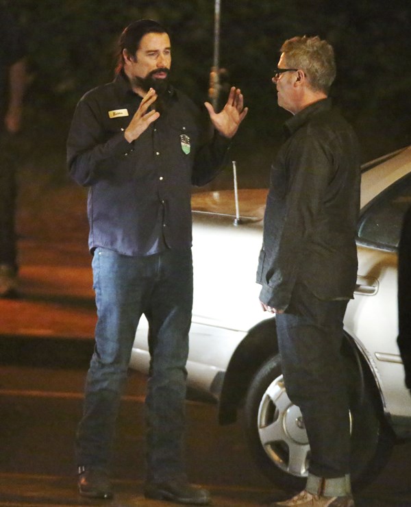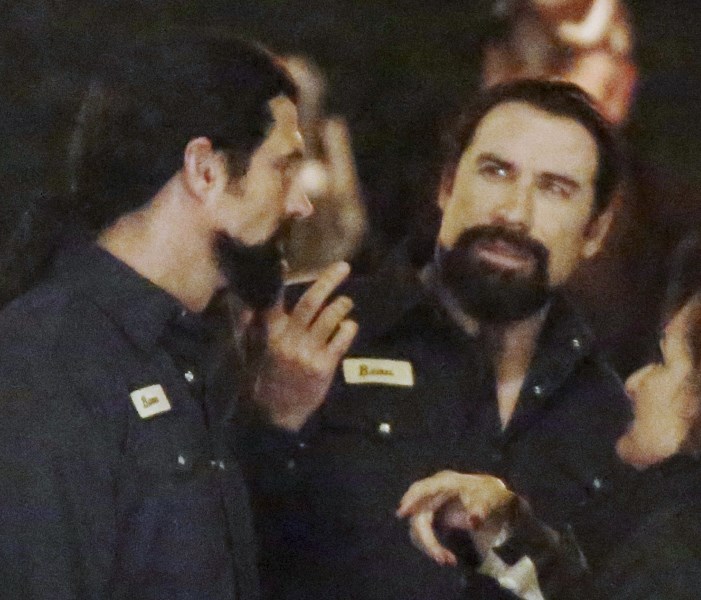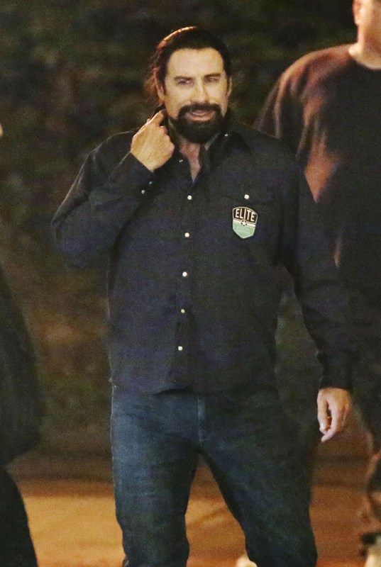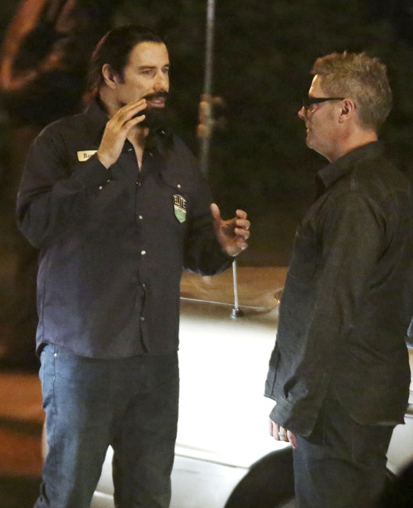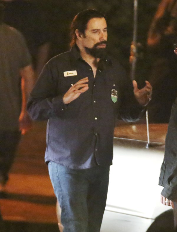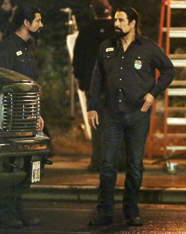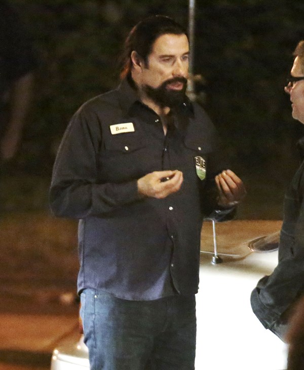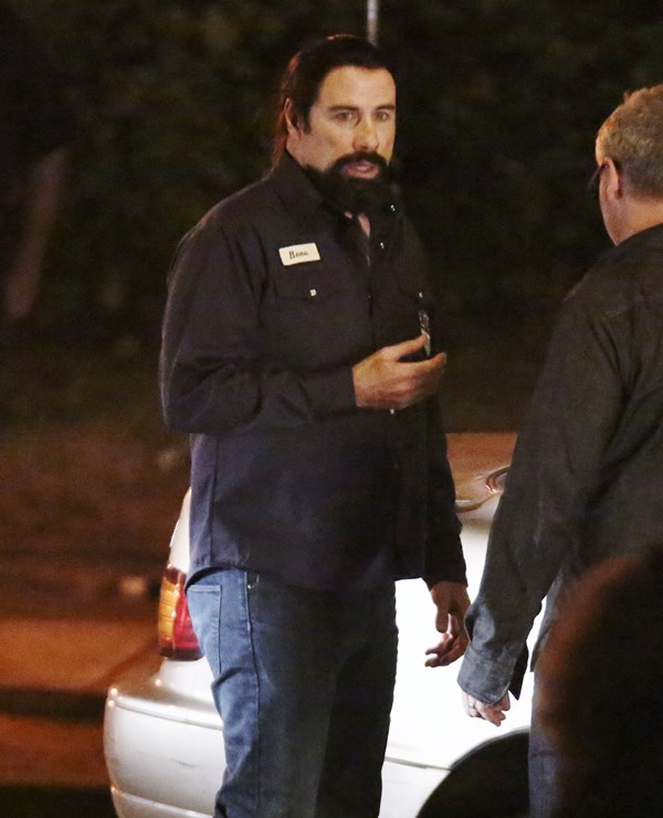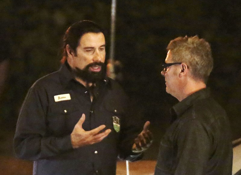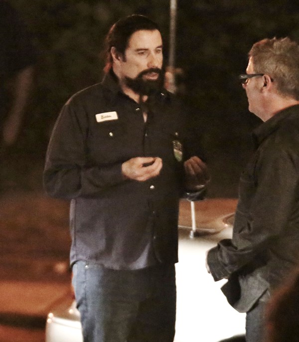 “John Travolta shows his dedication to his craft as he films night scenes for his new movie Life on the Line on October 7, 2014 in Vancouver, Canada. After discussing the scene with director David Hackl, John met with his stunt double to compare beards. The film is about a crew of men who do high-wire work fixing the electrical grid when they're suddenly hit by a deadly storm.”