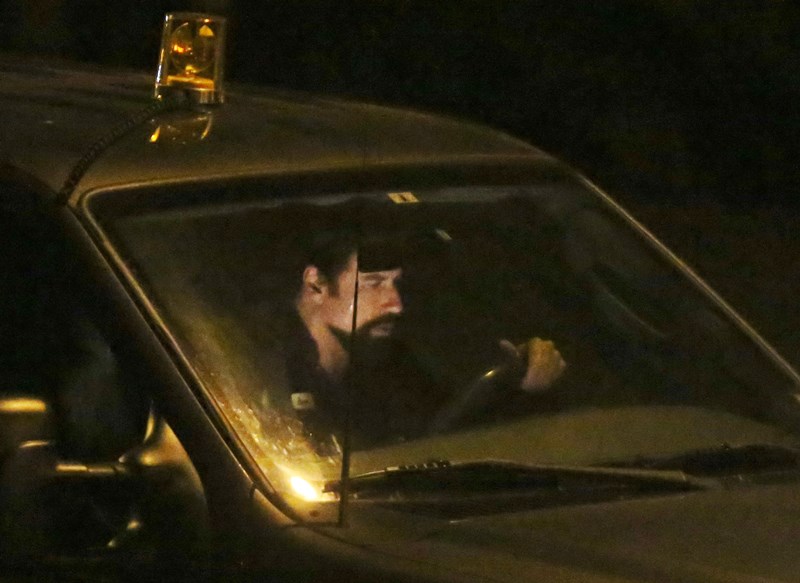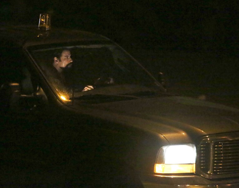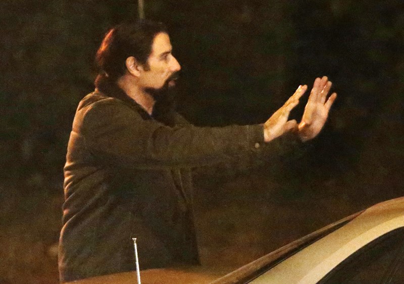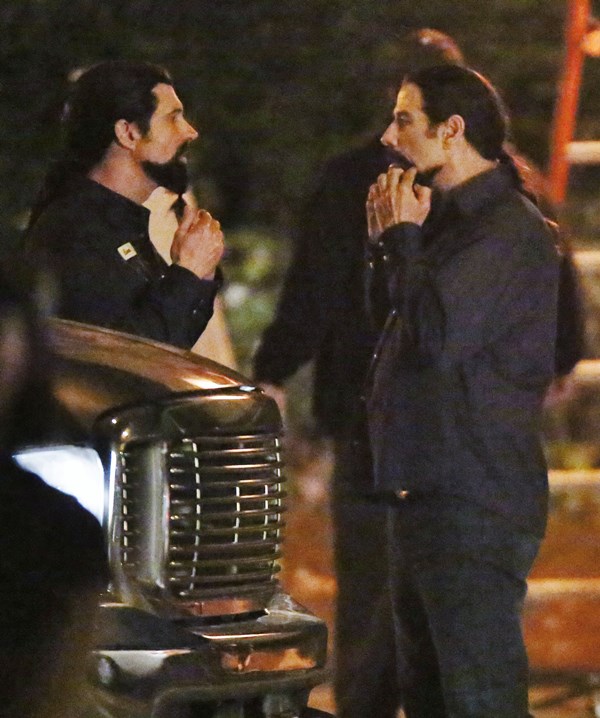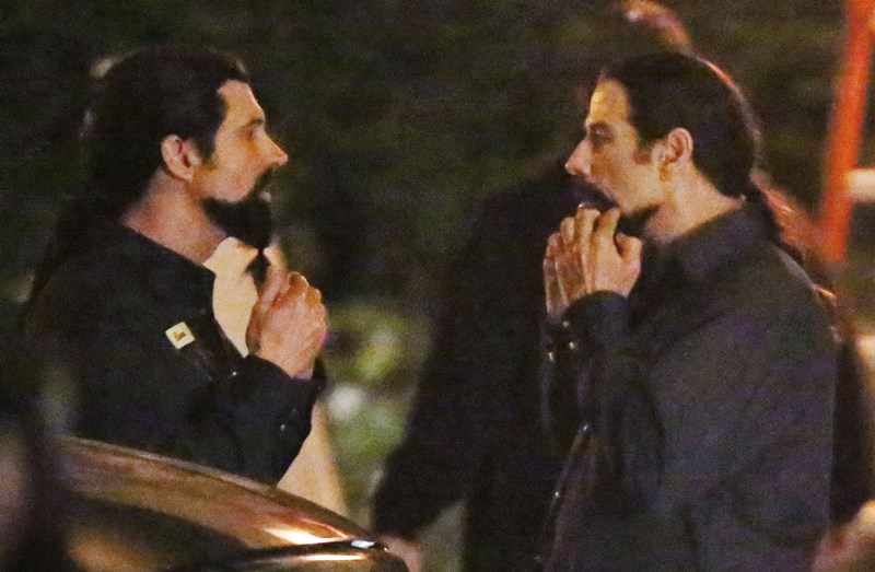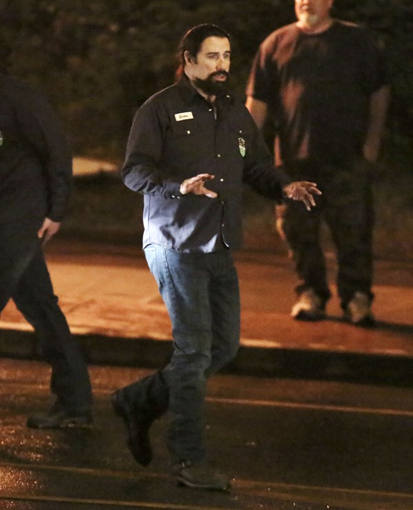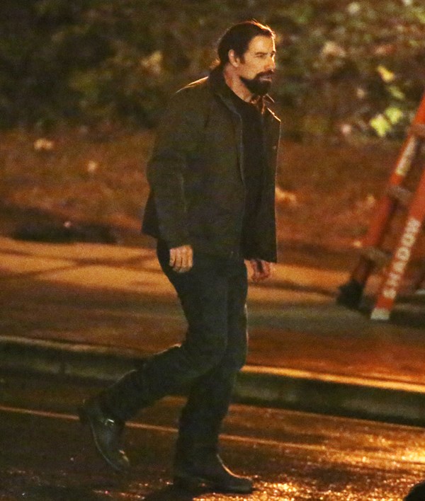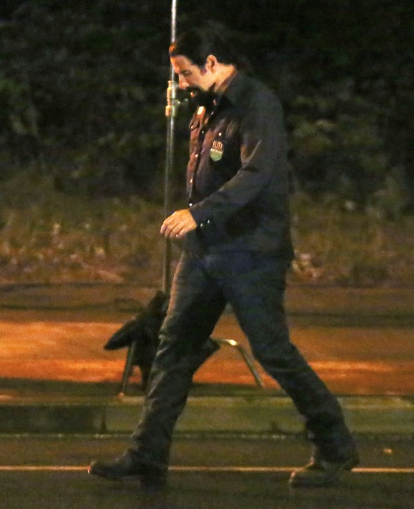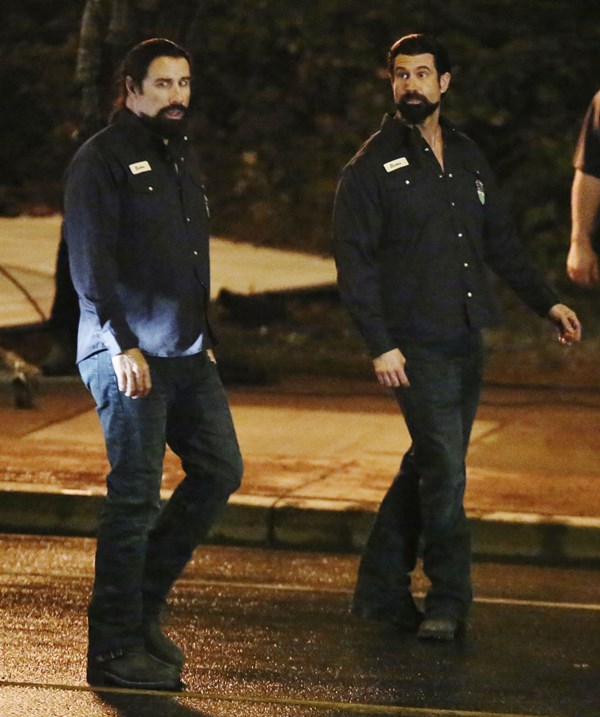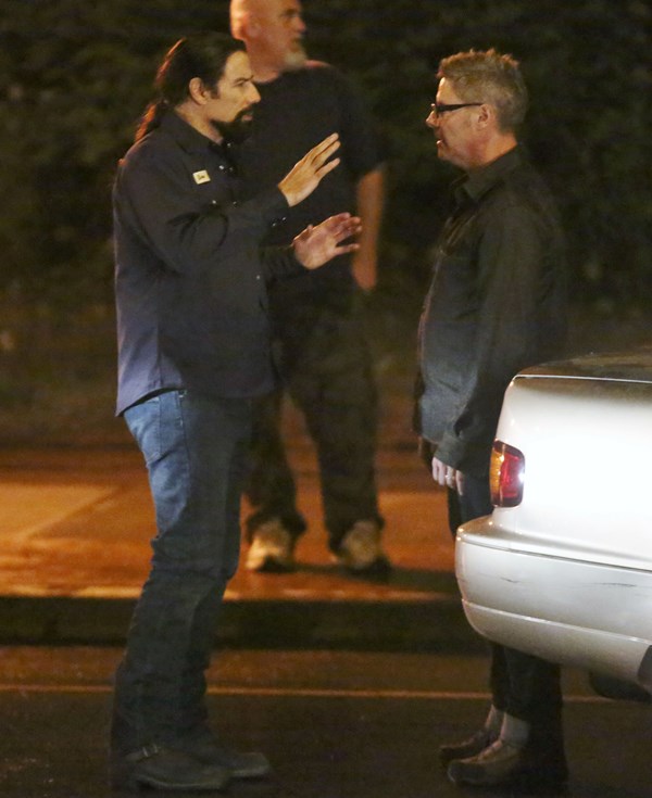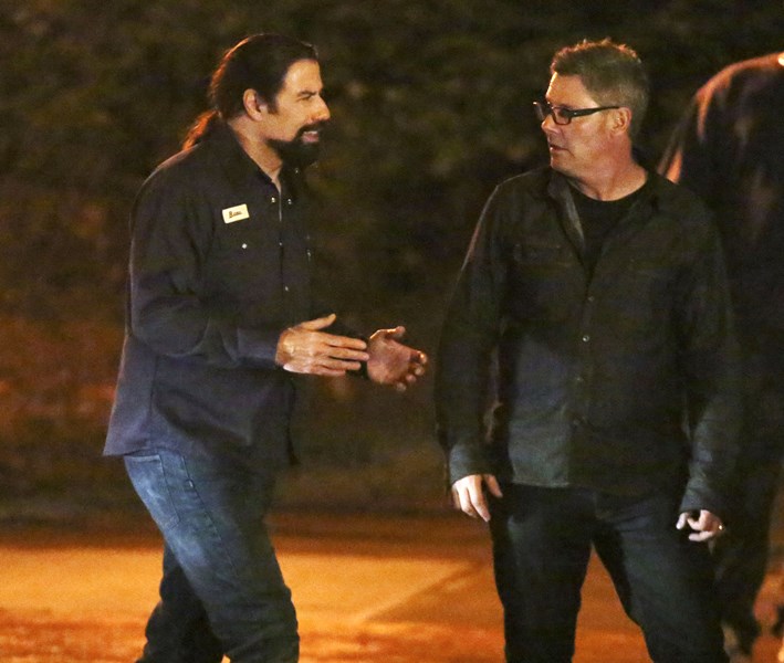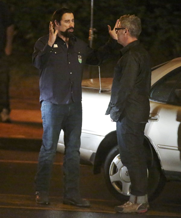 “John Travolta shows his dedication to his craft as he films night scenes for his new movie Life on the Line on October 7, 2014 in Vancouver, Canada. After discussing the scene with director David Hackl, John met with his stunt double to compare beards. The film is about a crew of men who do high-wire work fixing the electrical grid when they're suddenly hit by a deadly storm.”
