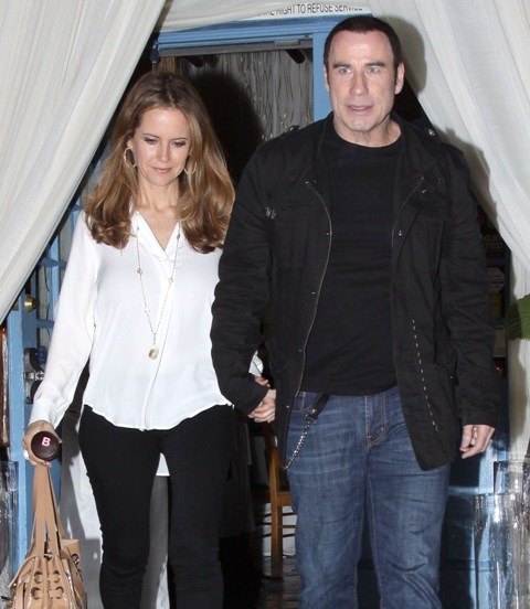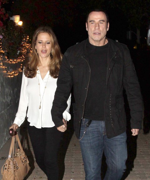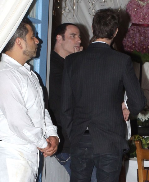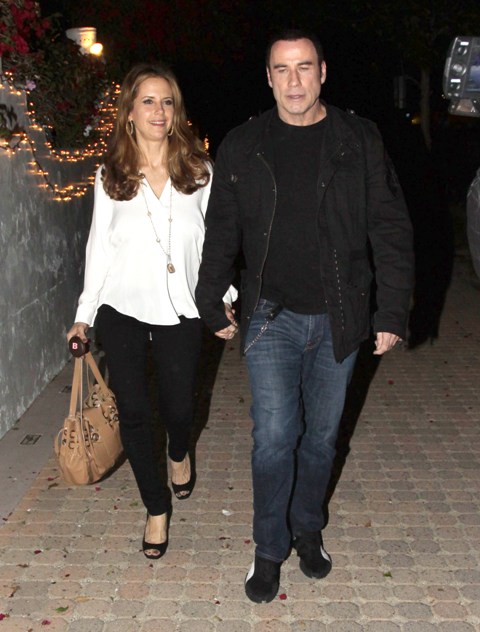 Here are John Travolta and Kelly Preston leaving at the end of the night. So...is that a wallet chain coming out of his jeans? This is the sh-t I wish Johnny Depp would cut out of his wardrobe. I mean, at some point it turns into a peace sign in every single photo, with blonde tips and spiked hair, and maybe a fake limp.