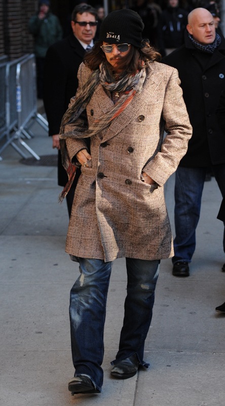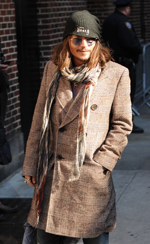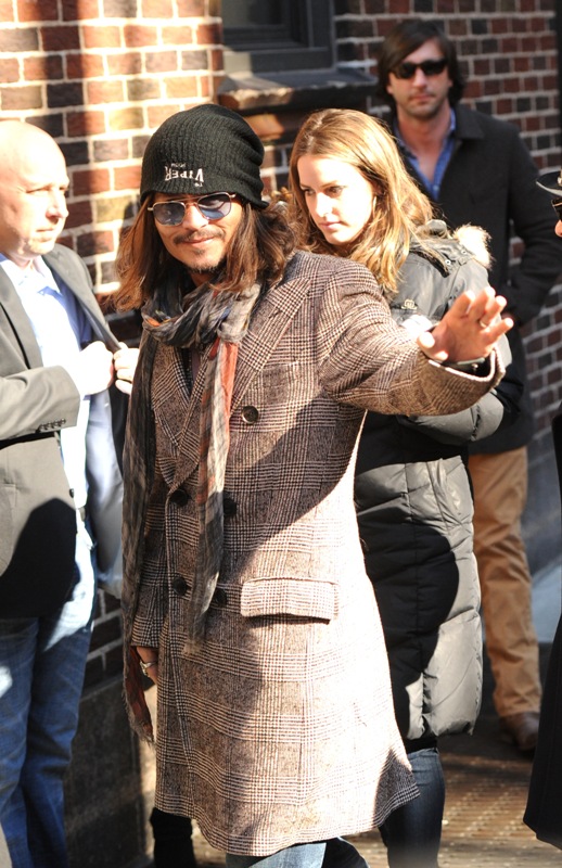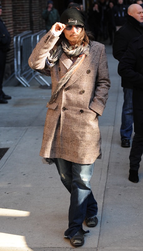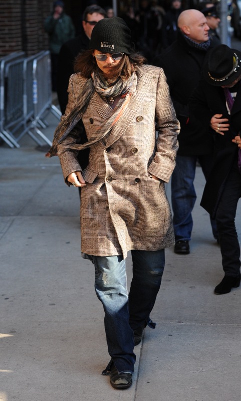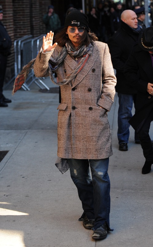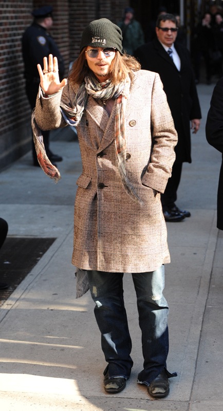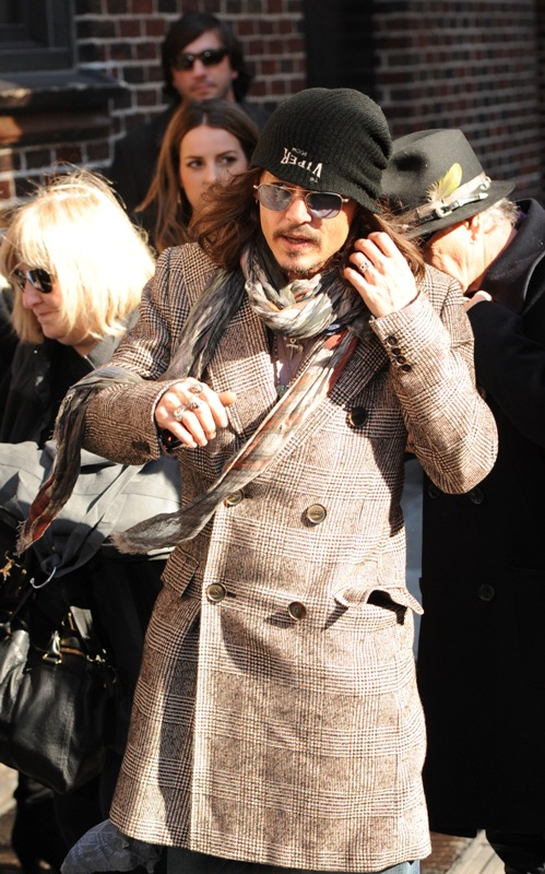 Here's Johnny Depp arriving at the Late Show today. I count 3 necklaces -- only?! Or are there more hidding underneath all that other business? Must be.
