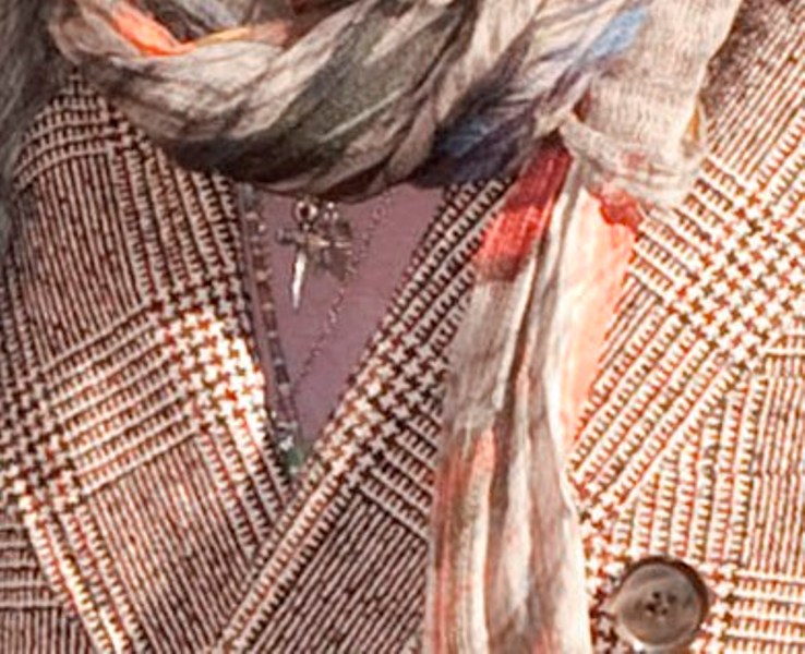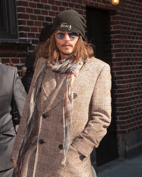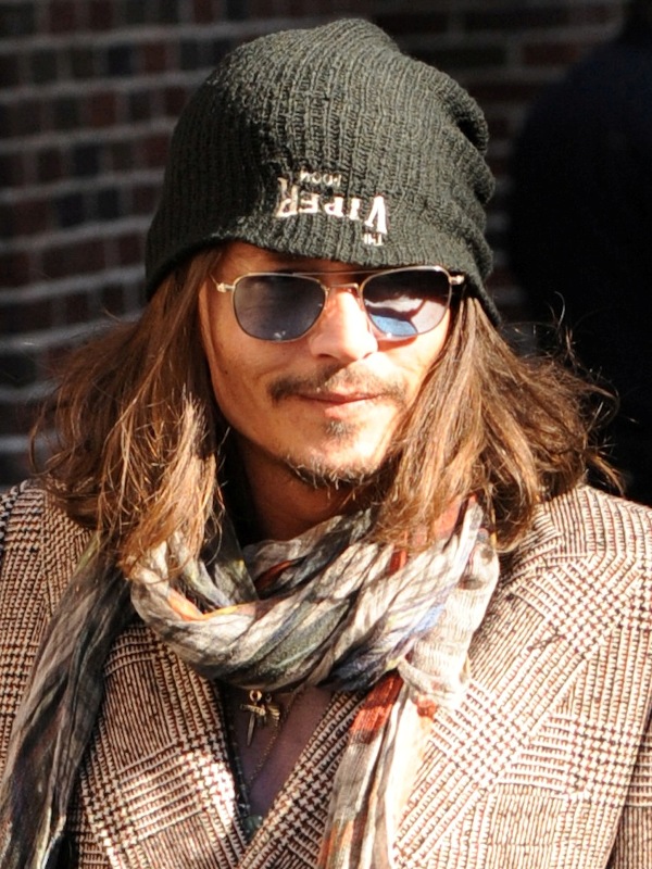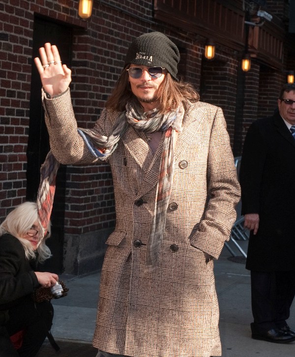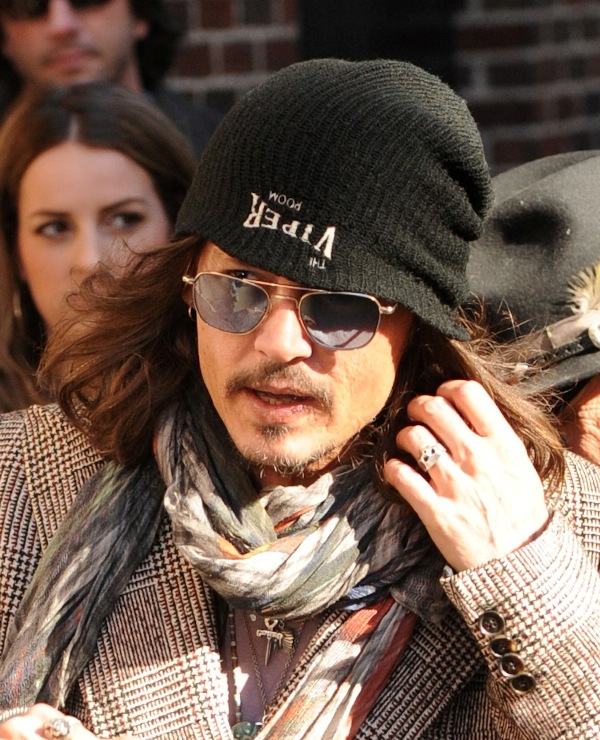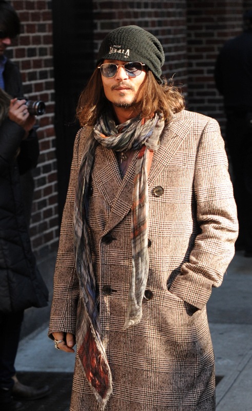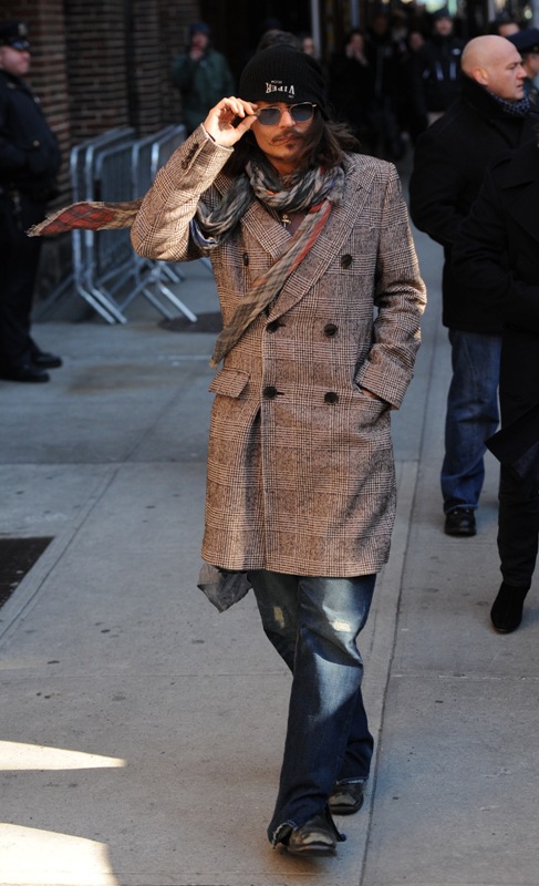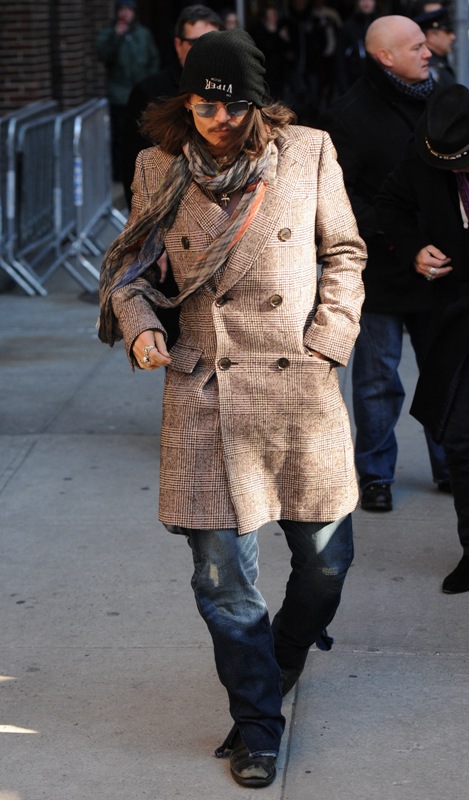 Here's Johnny Depp arriving at the Late Show today. I count 3 necklaces -- only?! Or are there more hidding underneath all that other business? Must be.