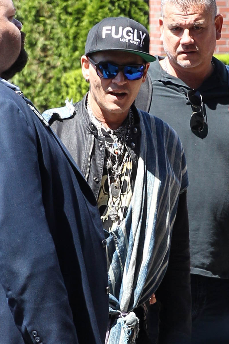 Johnny Depp is currently on tour with his band, the Hollywood Vampires. I still can’t say that with a straight face – the fact that he’s in a band and that it’s called the Hollywood Vampires. Here he is arriving in Pennsylvania yesterday with several chains and beads hanging off his jacket, several chains and beads hanging off his neck, a tattered poncho hanging around his shoulders, on top of a denim jacket, and whatever other layers he has going on under there. Oh and as many rings as he has fingers. And also lots of bracelets. It’s a never-ending list of accessories, all of them meant to show that he has a pure rock’n’roll soul. Loud and clear, JD. Loud and clear.