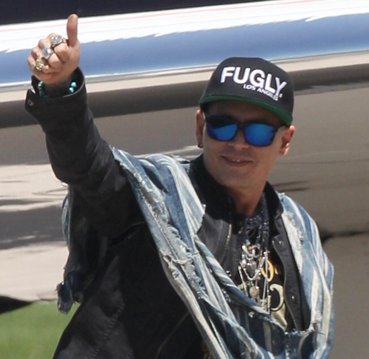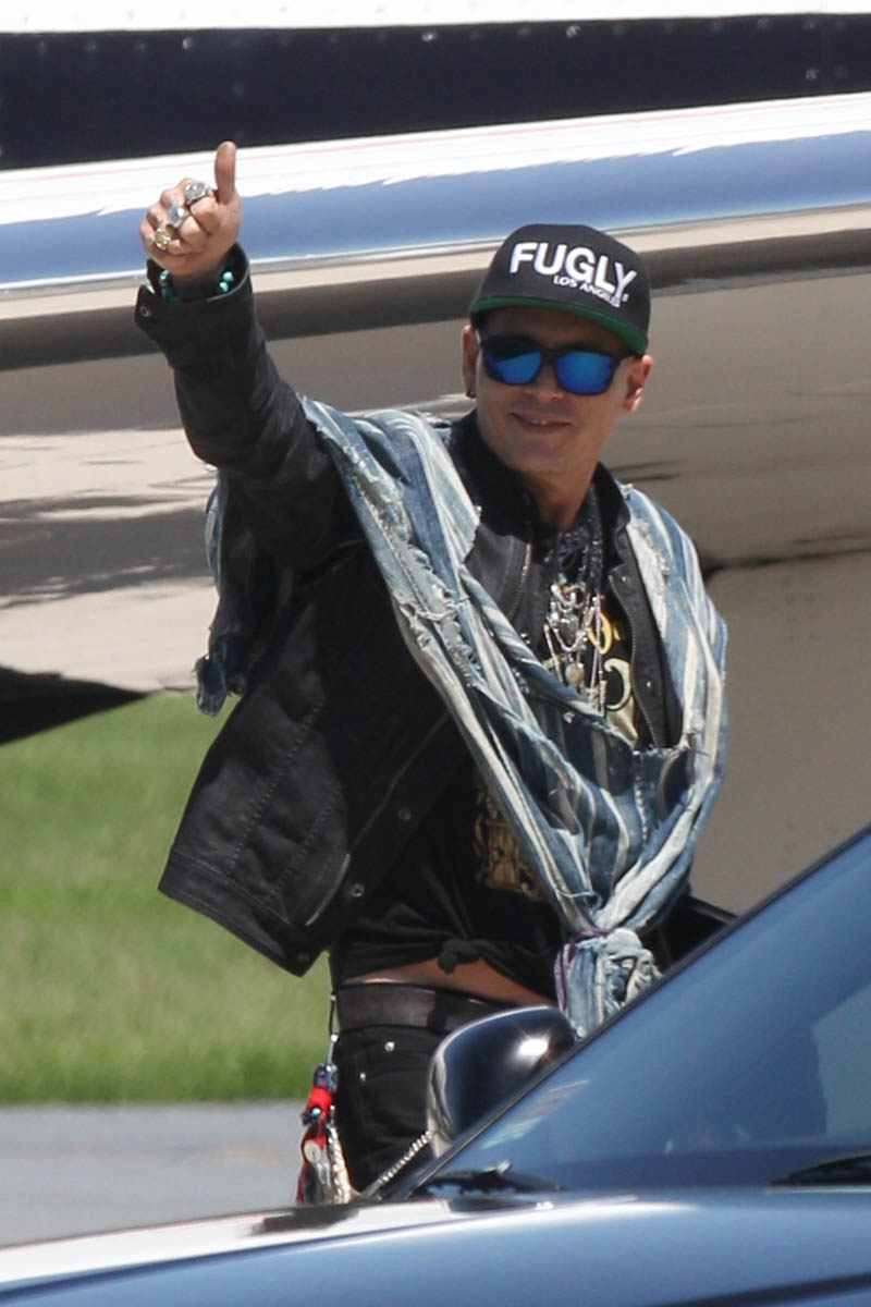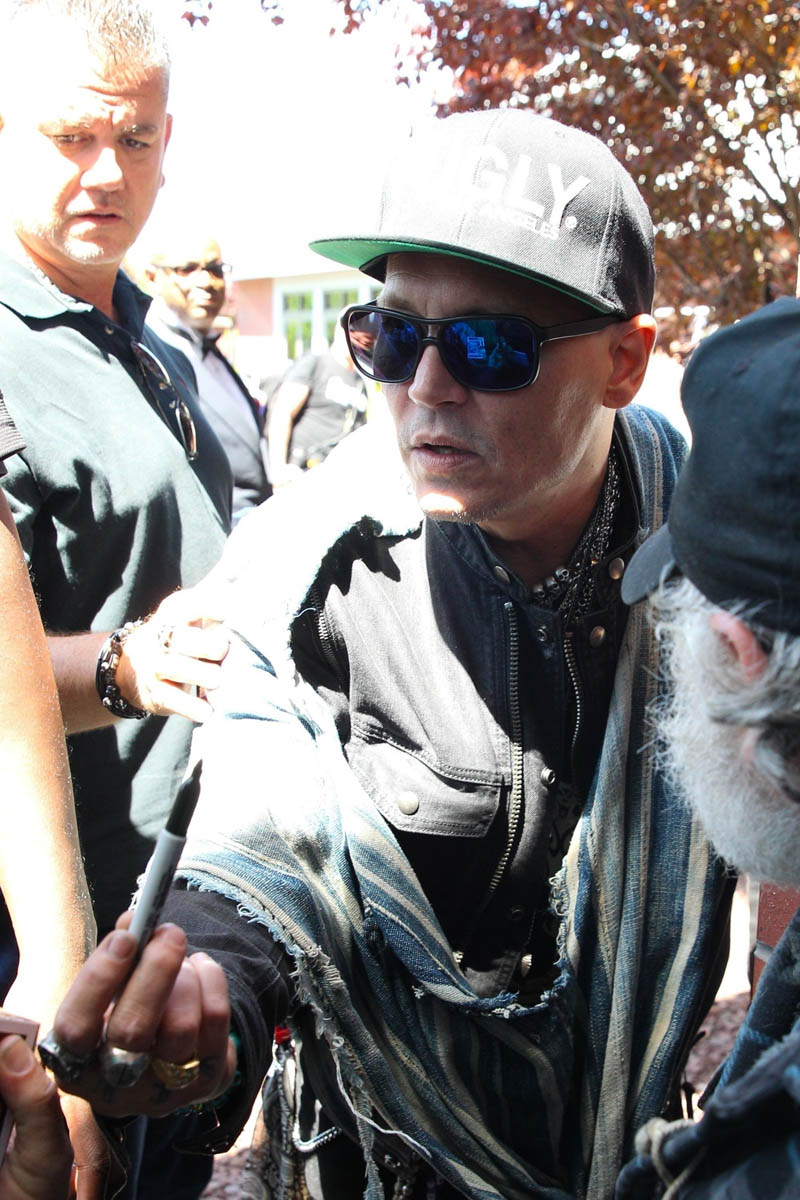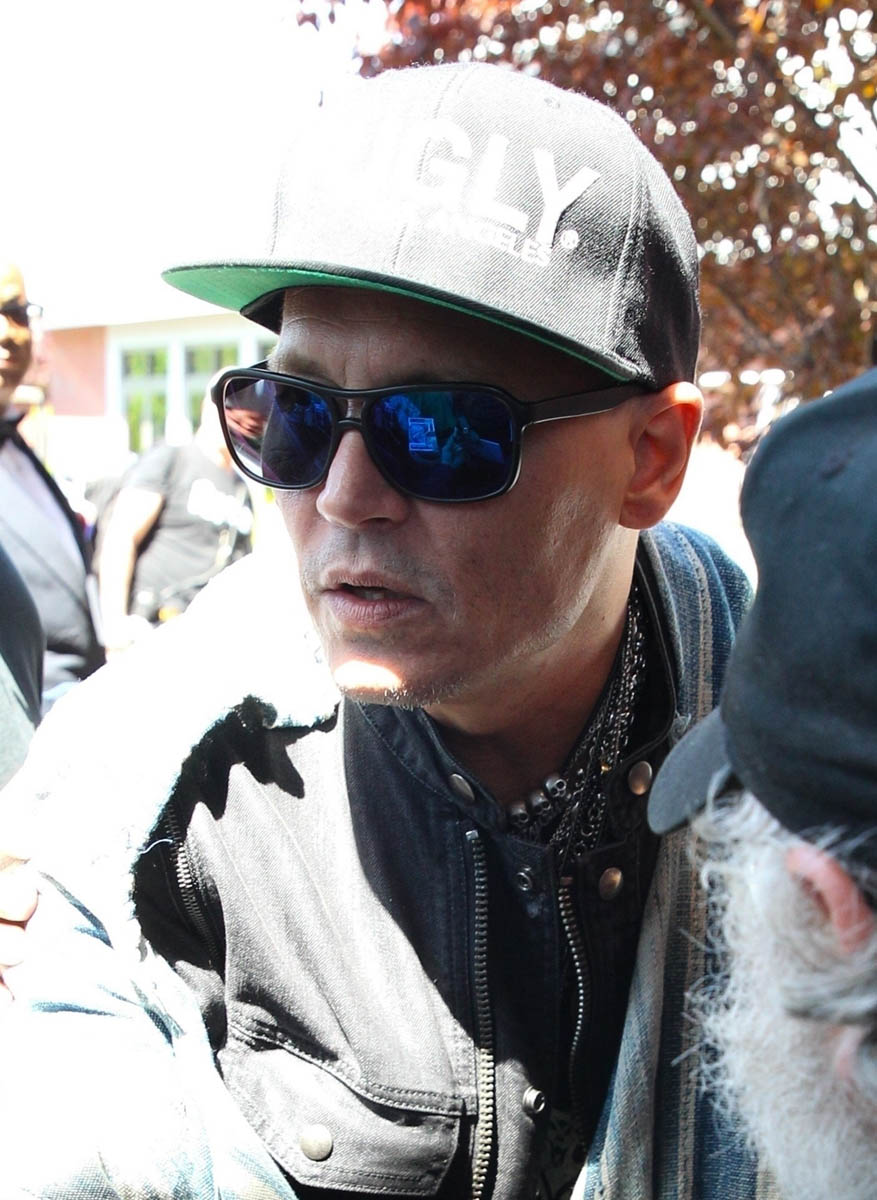 Johnny Depp is currently on tour with his band, the Hollywood Vampires. I still can’t say that with a straight face – the fact that he’s in a band and that it’s called the Hollywood Vampires. Here he is arriving in Pennsylvania yesterday with several chains and beads hanging off his jacket, several chains and beads hanging off his neck, a tattered poncho hanging around his shoulders, on top of a denim jacket, and whatever other layers he has going on under there. Oh and as many rings as he has fingers. And also lots of bracelets. It’s a never-ending list of accessories, all of them meant to show that he has a pure rock’n’roll soul. Loud and clear, JD. Loud and clear.