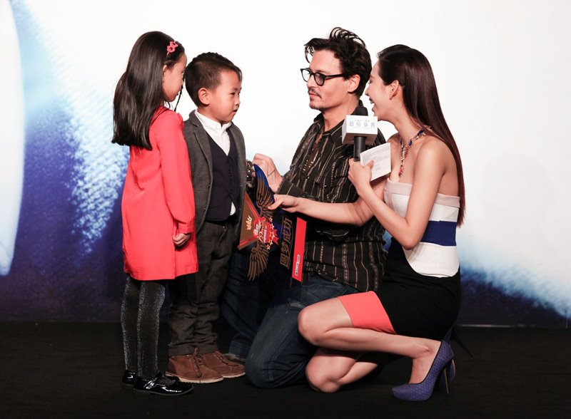 He’s being sweet with the fans in Beijing to promote Transcendence. I’m not being reminded that he’s engaged to a wannabe Angelina Jolie in her 20s. Feathers and scarves aren’t erupting all over his neck. It’s like a f-cking mirage. Now if only we could freeze him in this moment. Sitting down, rubbing his hands through his hair, smiling, pants obscured,